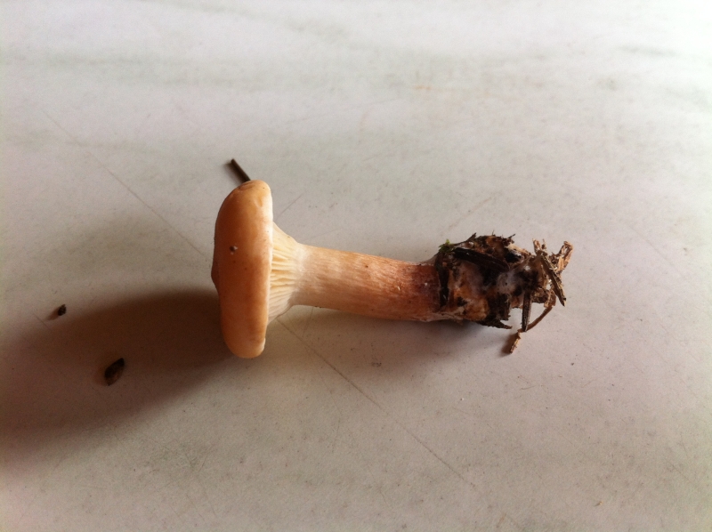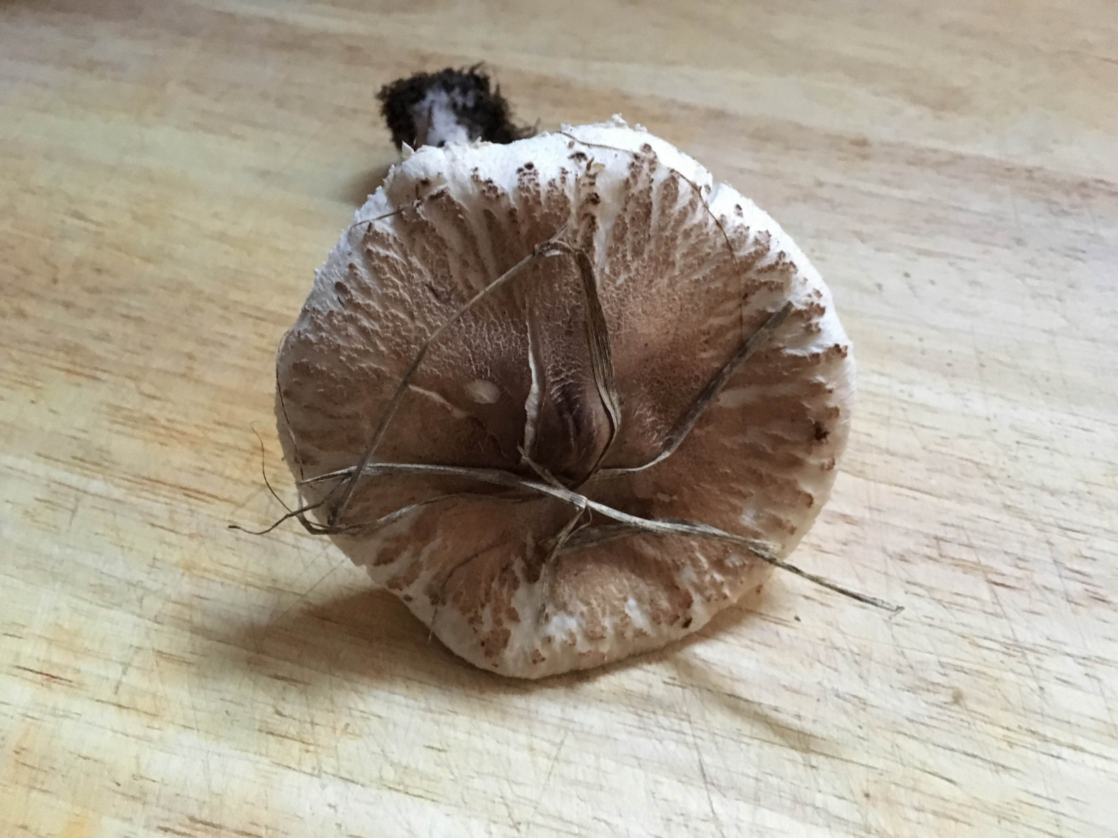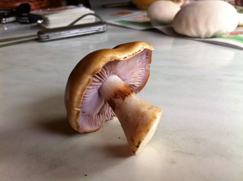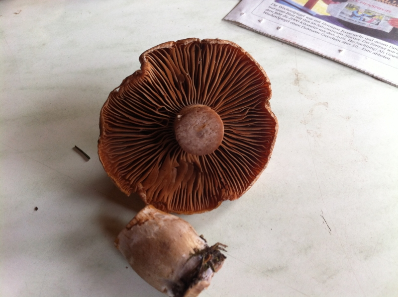 Jetzt hab ich mir auch nochmal den Pilz von unten angeschaut. Er hat abwechselnd kurze und lange Lamellen.