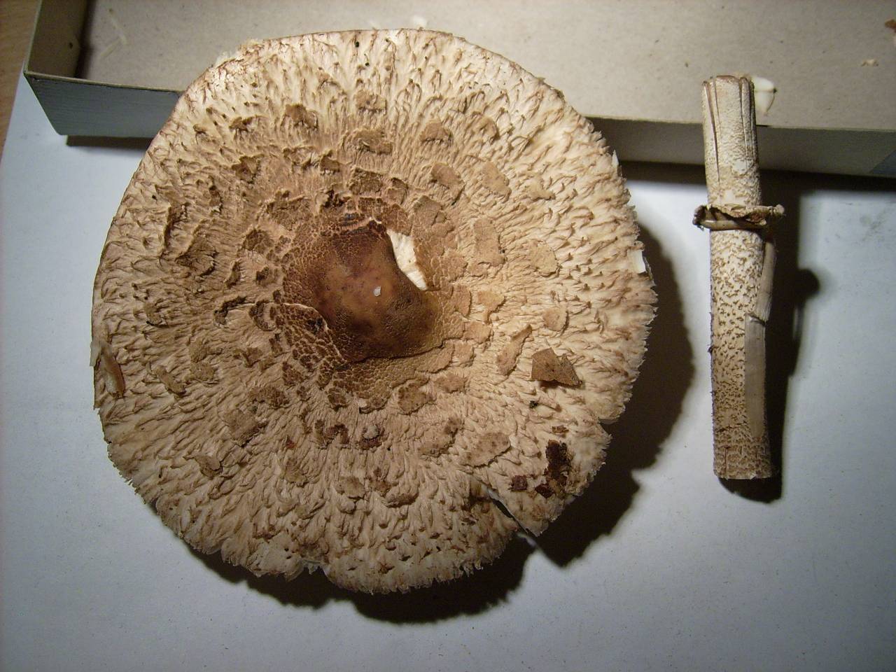 #24: Einige Meter nebendran, der Hut sieht meinem Buch nach sehr nach Safranschirmling aus, dazu passt allerdings der Stiel nicht so ganz, oder? Vielleicht doch ein Parasol, oder ein Grobscholliger Riese? Genattert sieht es ja eigentlich auch nicht aus: