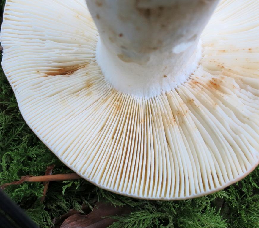 Lamellen: weiß bis zart gelblich, engstehend, am Stiel recht oft gegabelt, frei,spröde, mit einigen Rostflecken.