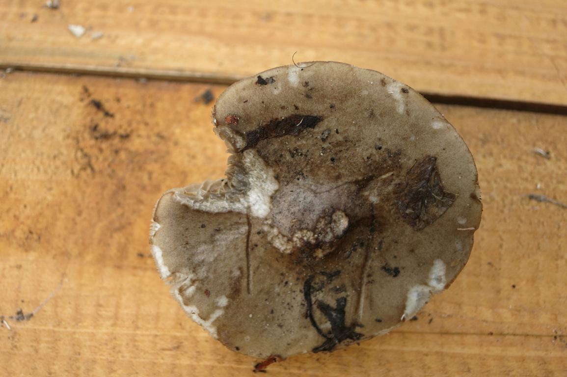 Hut: Die Kleineren bis ca. 4 cm DM, der Große verunstaltete 6 cm, graubraun, verwaschen, wellig verbogen, etwas eingerollt, eingerissen, Hh ziemlich dick aber gut abziehbar.