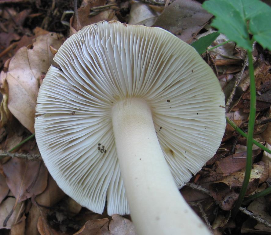 Lamellen: erst weißlich später lachsfarben, ganz frei, bauchig mit vielen verschiedenlangen Lameletten.