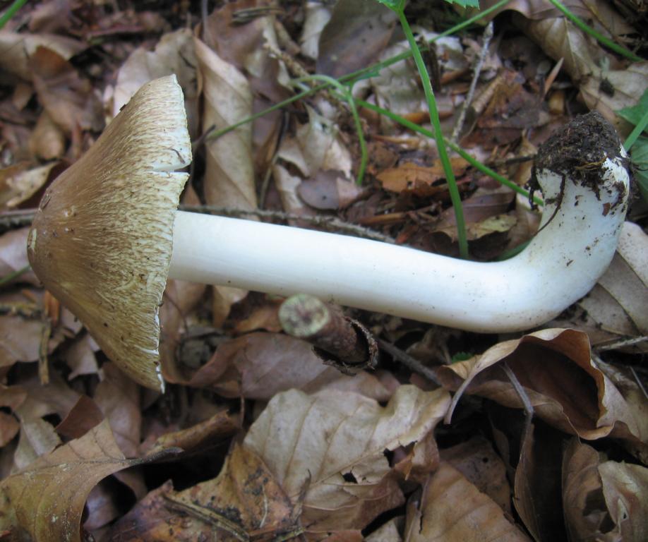Stiel: der gerade Teil 10 x 1,3cm, ziemlich gleich stark, der gebogene 2,5cm Basis leicht abgesetzt und etwas knollig, längsfaserig, weiß, ganz hell etwa wie quergenattert und im Spitzendrittel bereift.