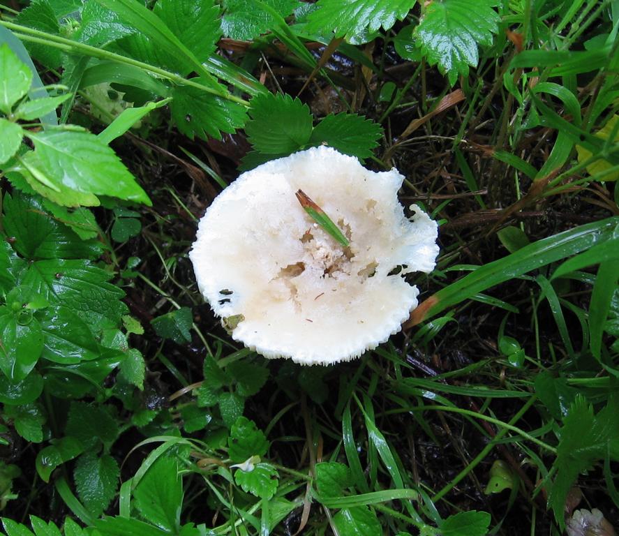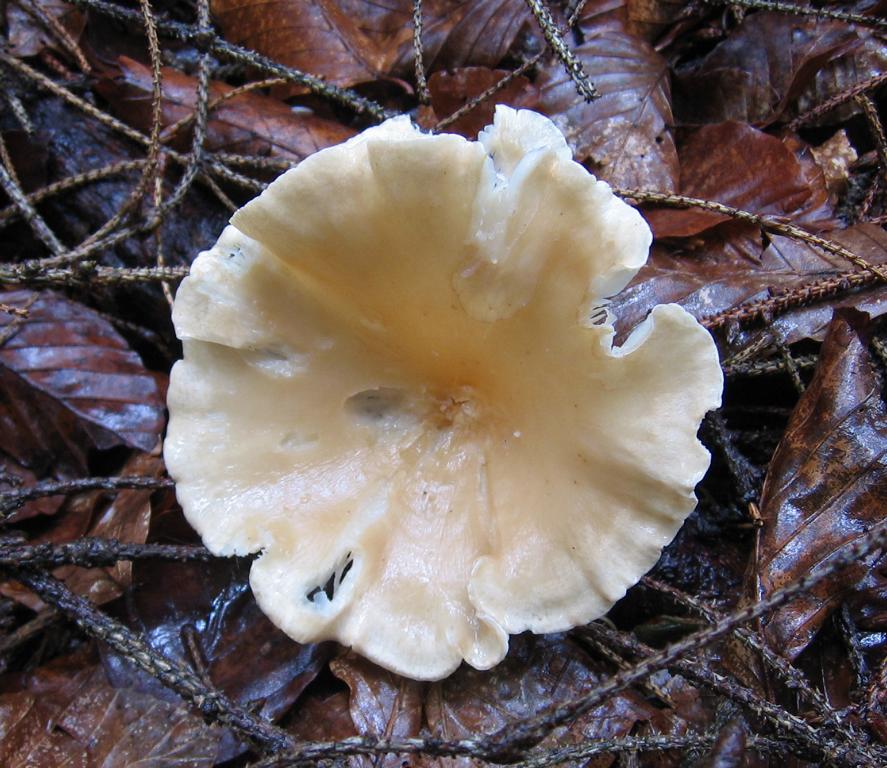 Hut: ca. bis 8cm, ausgebreitet, trichterig, cremebräunlich, Rand etwas gerieft (schlecht zu beurteilen)