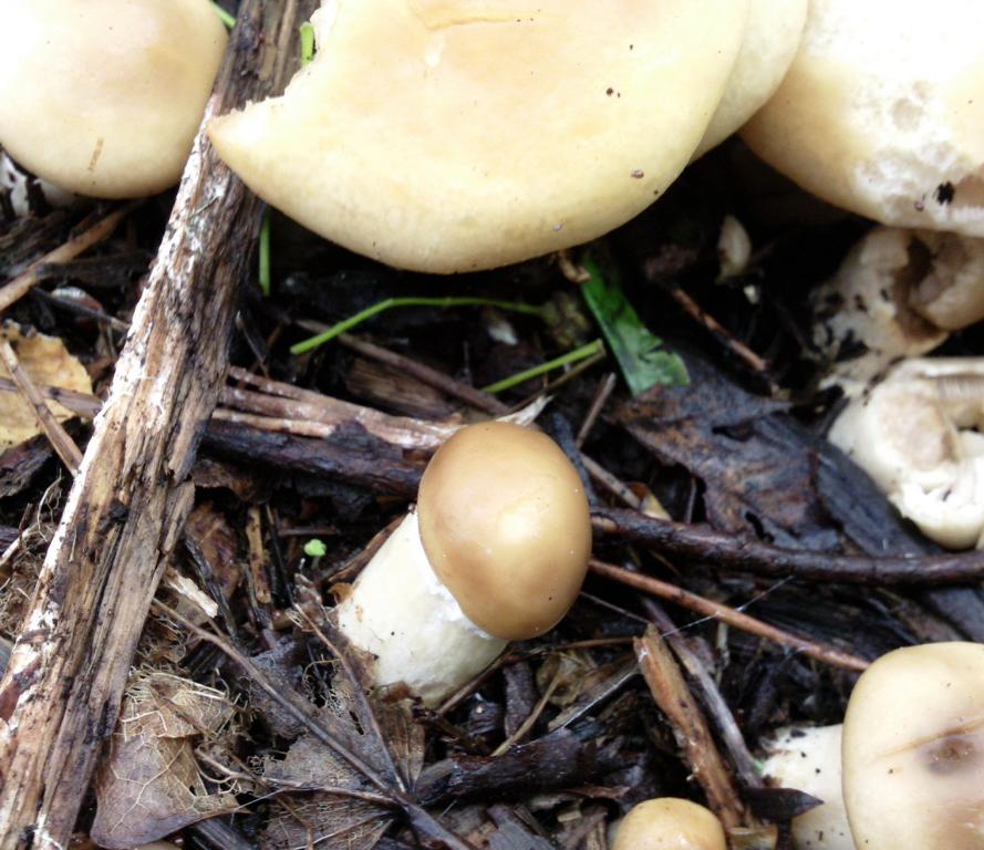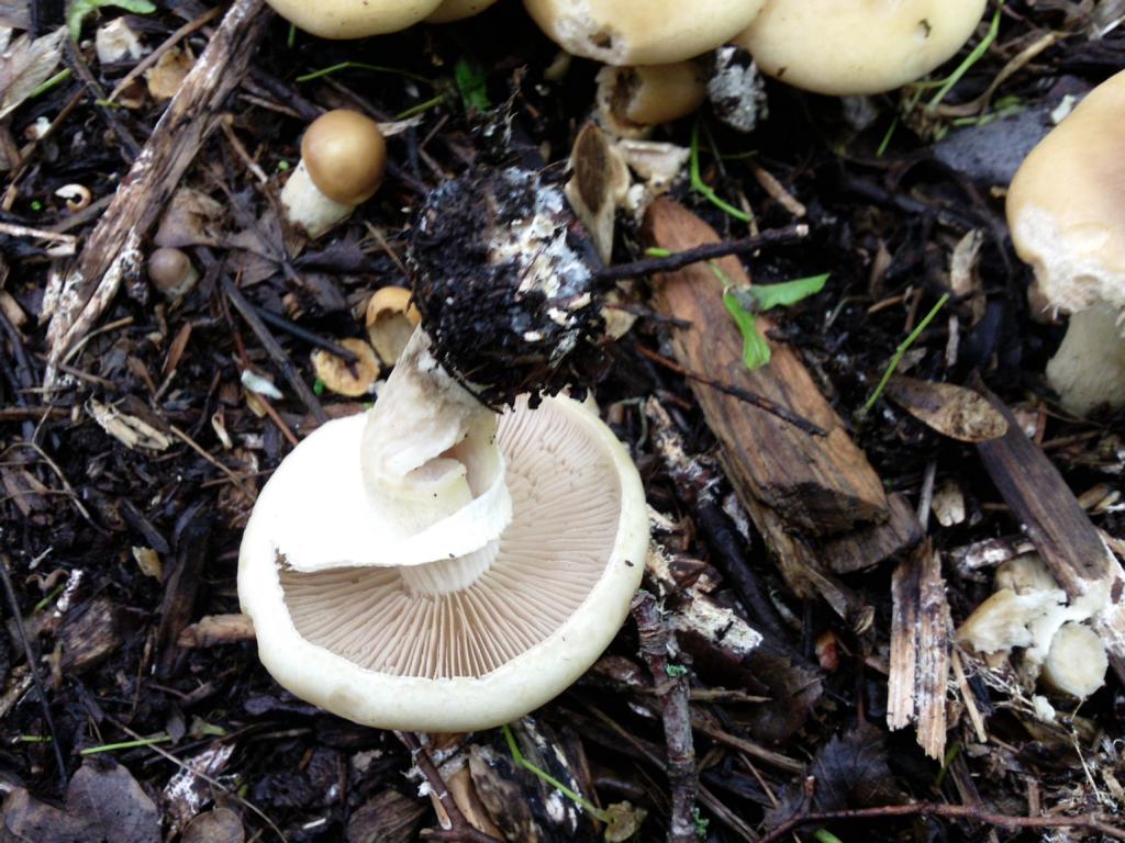 Lamellen: jung creme dann zart rose bis im Alter braun, viele versch. lange Zwischenlamellen, gewellt, zum Stiel abgerundet angewachsen, Schneiden scheinen etwas heller.