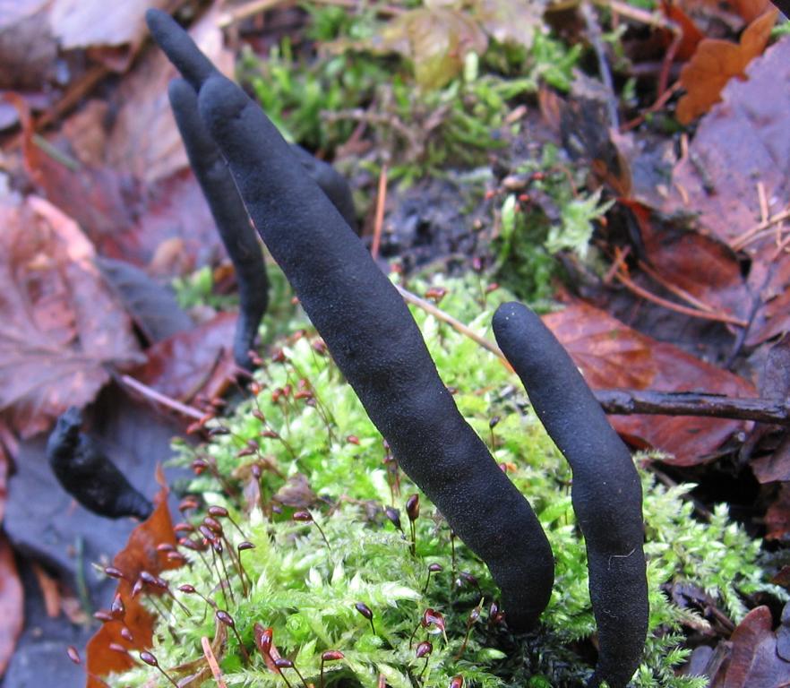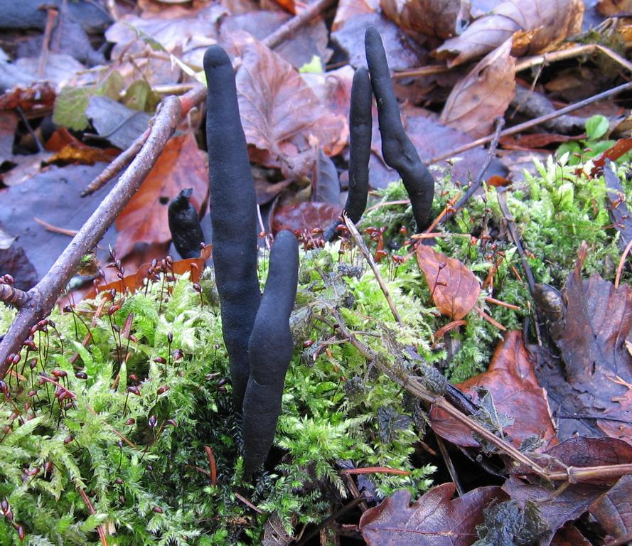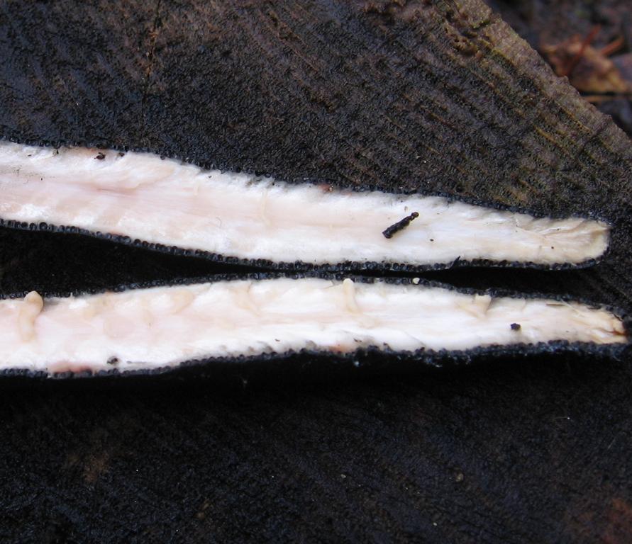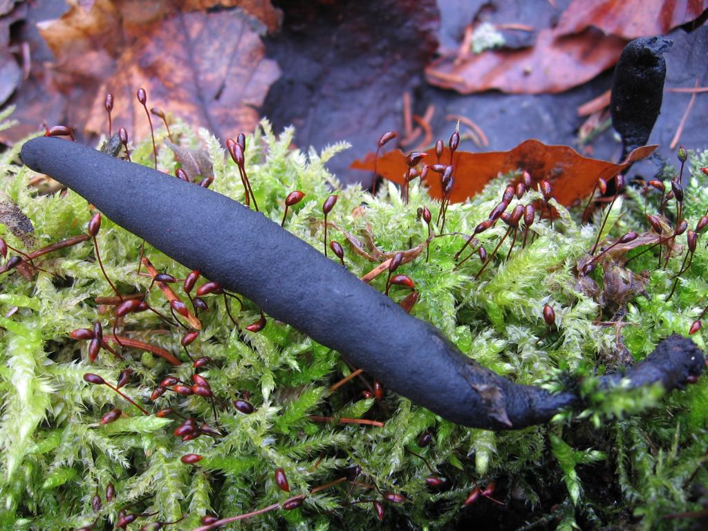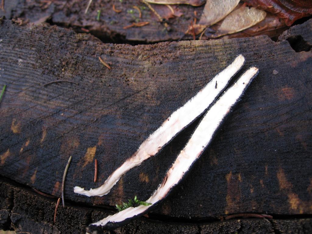 FK: ca. 10 x 1cm, schwarz, bohnenförmig, auf alten, bemoosten Laubholzästen auf dem Boden festgewachsen, gesellig, innen weiss.