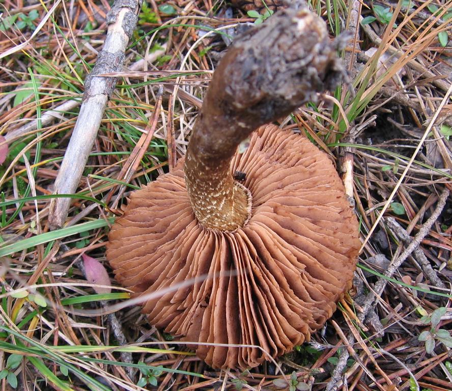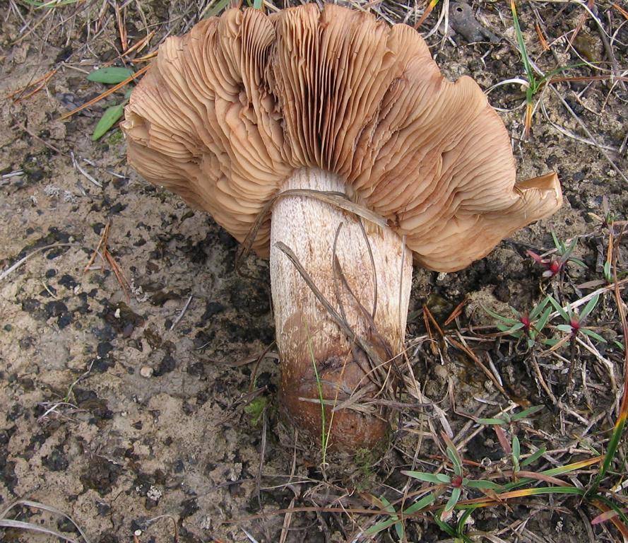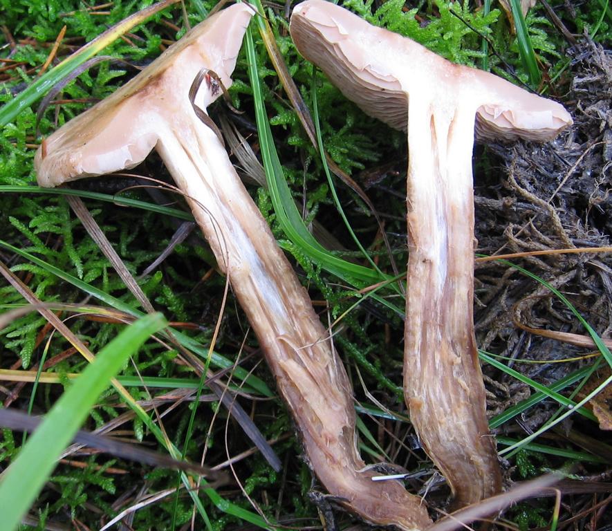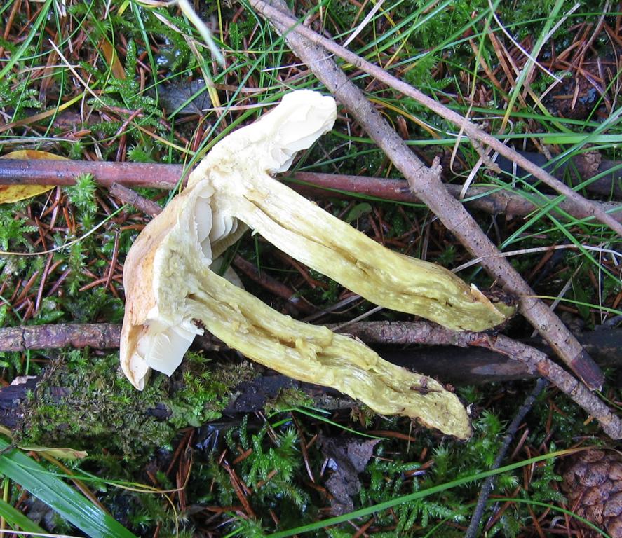 Stiel: 9 x 2cm erwachsen, stark gelb, leicht zylindrisch, voll, längsfaserig, zur Basis zart rotbräunlich