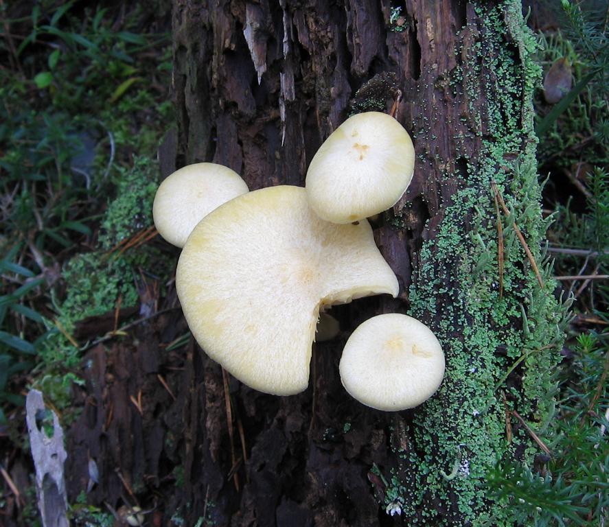 VK: Wie oben erwähnt ziemlich stark vermorschter Kiefernstamm in Wacholderheide. Die Pilze sind richtig im Stamm verwachsen und ohne abreissen nicht entfernbar, müsste ich rausschneiden.