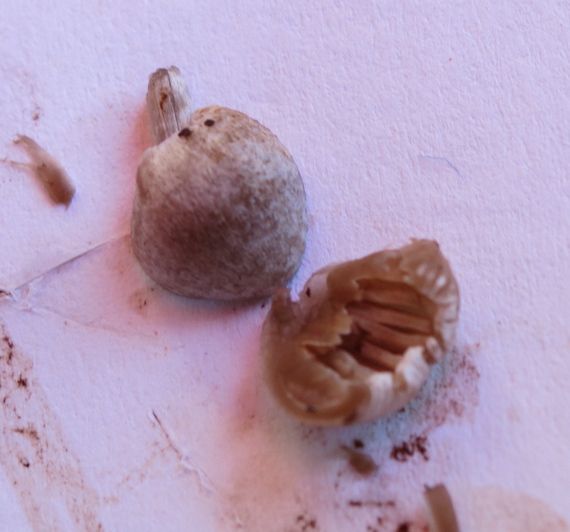 Hut glockig mit stumpfer Spitze, Höhe bis 4cm, ganz zart gerieft, sehr verschiedenfarbig (jung rotbräunlich über scheckig nach beige graugelblich mit orangem Zentrum (s. Bilder).