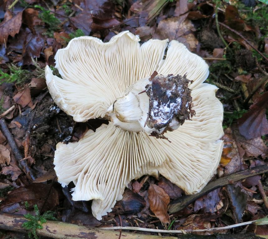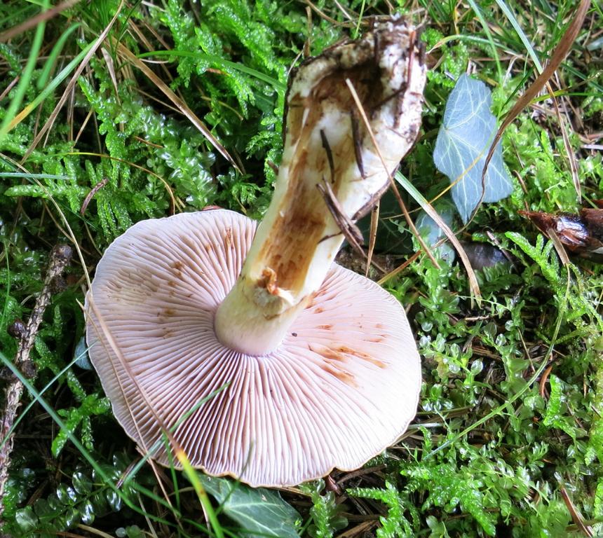 Lamellen: etwas heller auch leicht rostfleckig, engstehend angewachsen, viele Zwischenlamellen in versch. Längen.