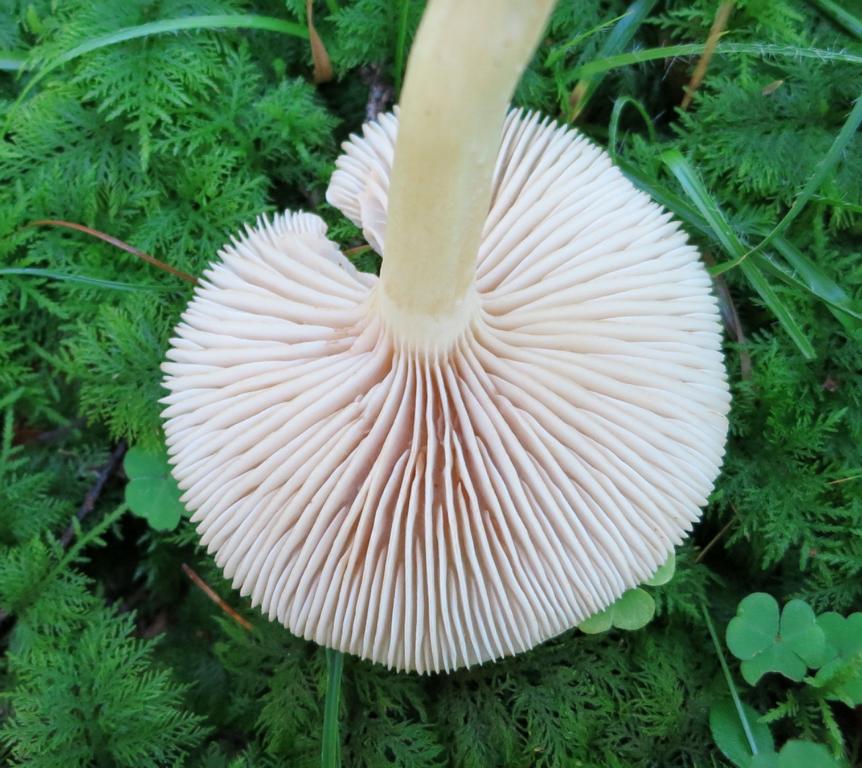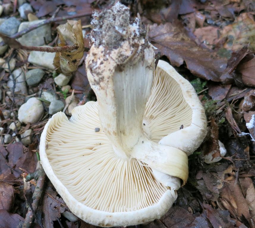 Lamellen; schmutzig weißlich beige, engstehend, frei, Schneiden gekerbt, des Öfteren am Stiel gegabelt.