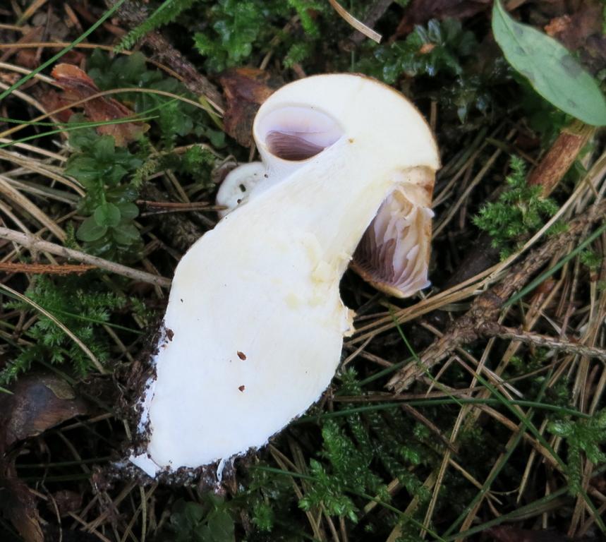 Stiel: ca. 6 x 0,5-1,0cm, zur Basis abnehmend mit weißem Mycelfilz bestückt, gleichfarbig wie der Hut, hohl, zusammengedrückt, mit weißer Masse (Mycel?) gefüllt.