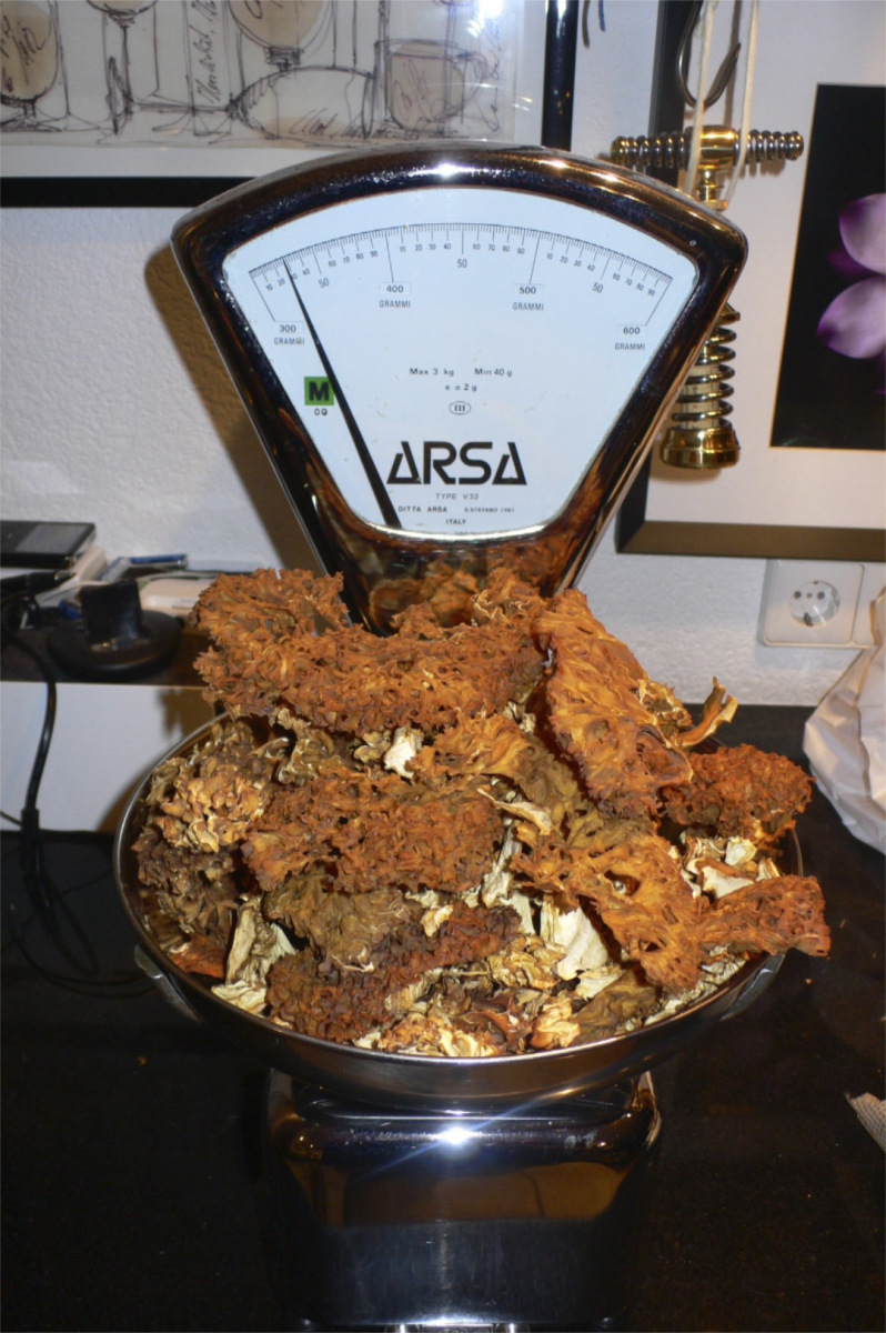 Hier ein paar Bilder der Monsterglucke,  CDMGott bin ich froh, dass wir nicht den Weltmeister verputzt haben; heute haben wir die ehemals restlichen 3,4 kg aus dem Ofen genommen. Sind nur noch mickrige 330 g übriggeblieben, wie aber schon gesagt lässt sich die KG wie Morcheln bestens trocknen und hat nach dem Einweichen fast das Frischgewicht wie auch Kosistenz und Geschmack. die kleinen Bruchstücke kann man auch gut zu Pilzpulver mörsern und zur Geschmacksunterstützung in Saucen geben. Jederzeit auch als Morchelersatz zu verwenden, ruhig mal mit etwas weißem Portwein ablöschen und dann reduzieren und zum Schluss einkaltes Stück Butter einmontieren, abschmecken und zu gebratenem Fisch, Wild oder Geflügel servieren. Die getrockneten peppen auch jedes Pilzmischgericht auf, weil sie immer ein bisschen knurpschpelig bleiben. Also IMMER VERWENDEN!!!!! KG ist ein toller Pilz
