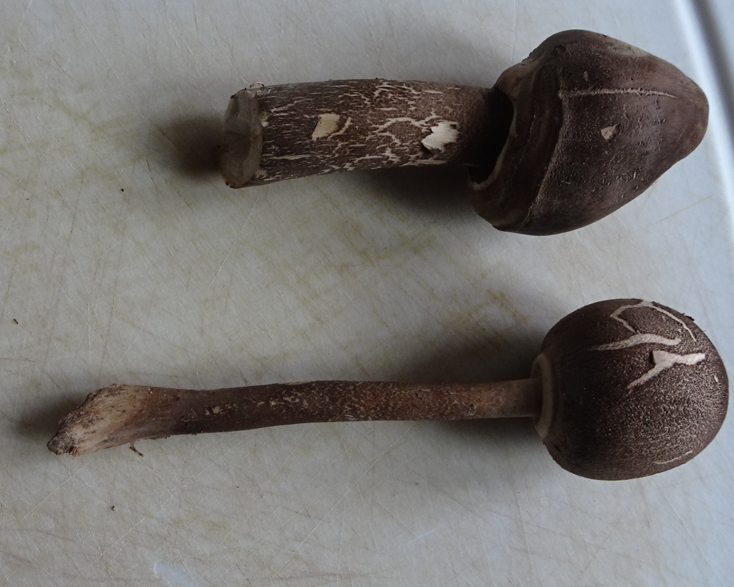 Bei dem andern Pilz schwanke ich immer noch zwischen euren Möglichkeiten. Der Stiel ist übrigens sehr faserig und schwärzlich, beim Durchschneiden ganz grau. Von melanoleuca cognata habe ich in einem Pilzbuch ein foto vom durchgeschnittenen Stiel, der ist ganz hell. Die Lamellen sind jetzt bei gutem Willen vielleicht doch eher etwas rosa statt creme. Aber deutlich ist das nicht. Jetzt versuche ich noch einen Sporenabdruck hinzukriegen. Dann melde ich mich wieder.