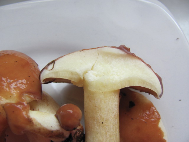 - Unterseite des Hutes: cremefarbige Rohren die weise kleine tropfen "geschwitzt" haben