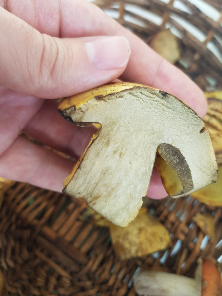 nach sehr langer Zeit kam ich vergangene Woche mal wieder in die Pilze. Ich konnte unter Roteiche neben einem Steinpilz und einem Flocki folgenden Röhrling finden. Ich hielt die Art zunächst für den Kornblumenröhrling, allerdings irritiert mich der Habitus (eher den Dickröhringen ähnlich) und die fehlende Kammerung im Stiel. Geht das hier vielleicht in Richtung Fahler Röhrling