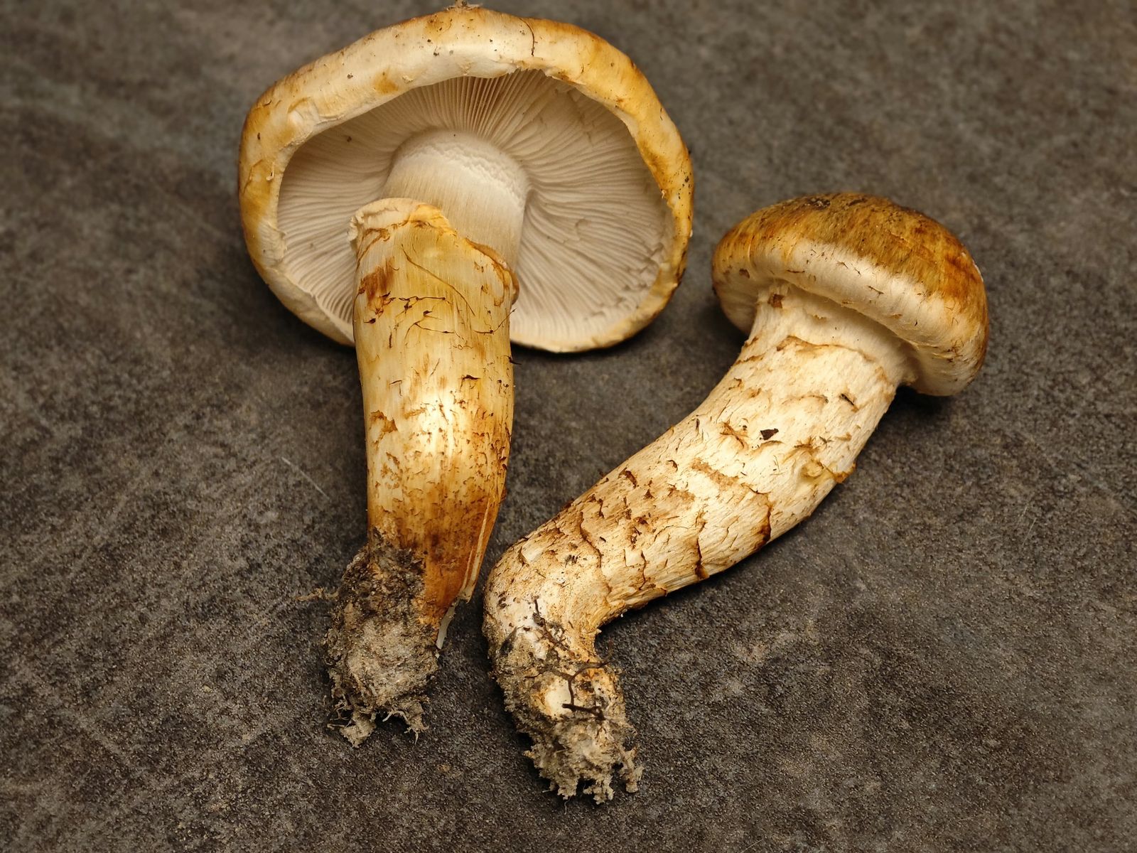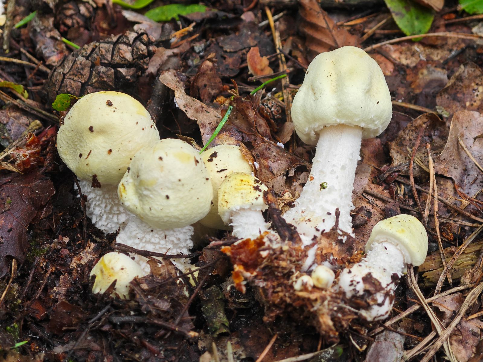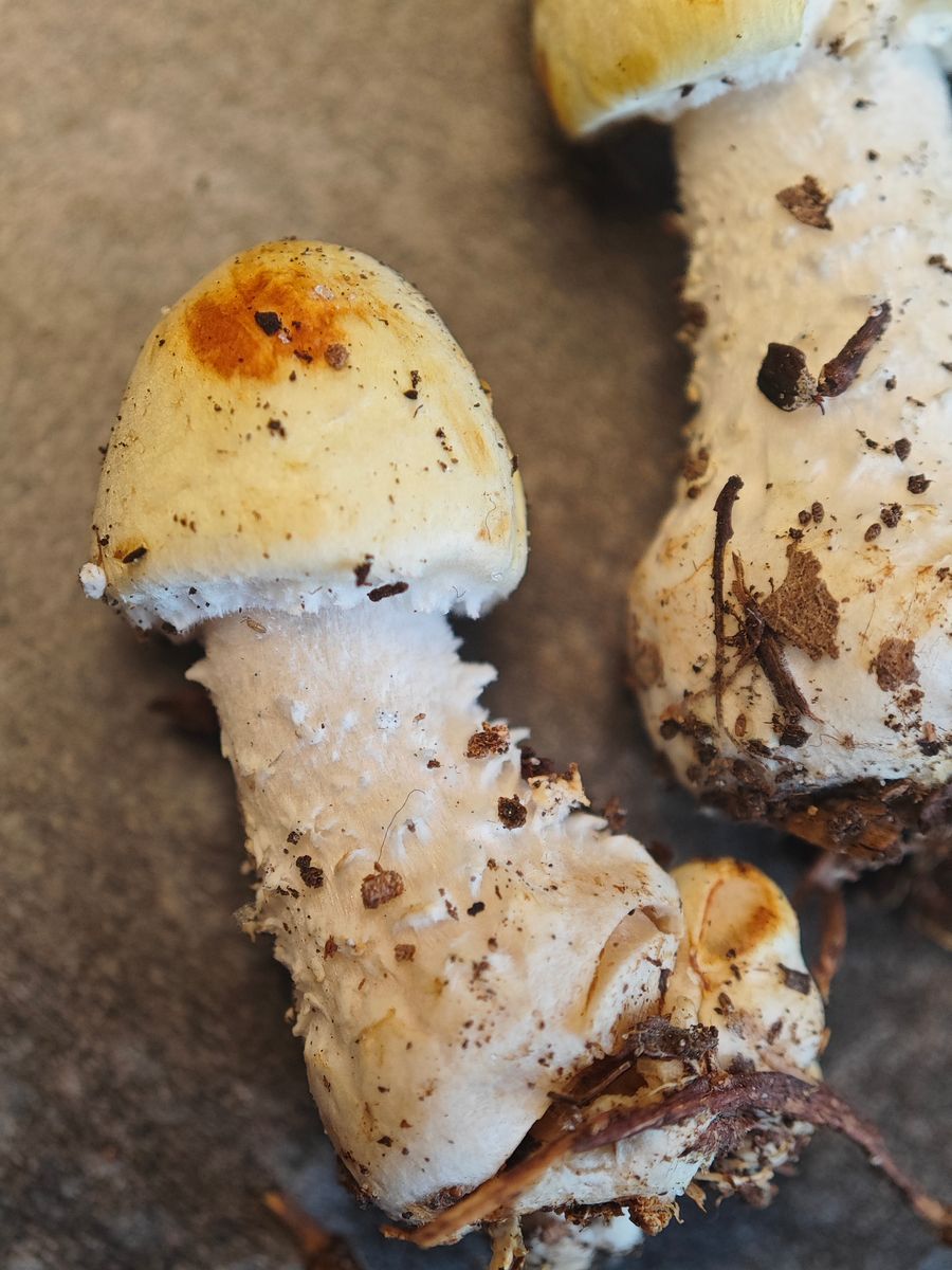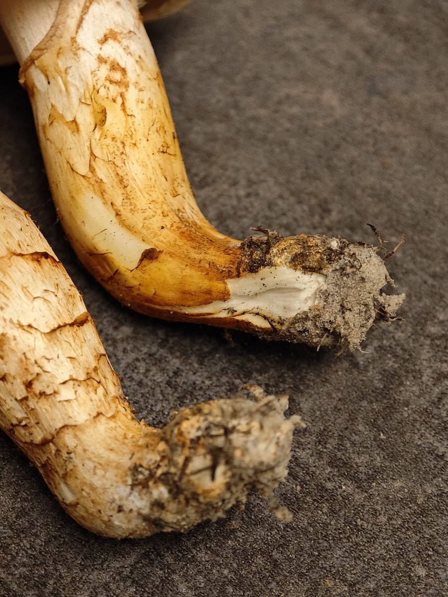 Stiel : weiß, flockig knollige Stielbasis, Myzelfilz, oberhalb hohl werdend