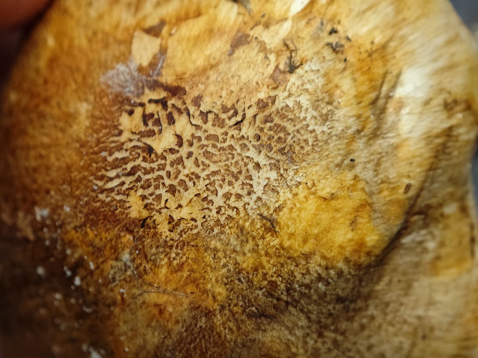 Stiel: dick, zur Basis teilweise spindelig zulaufend, nicht gekammert, eher laengsfaserig, benetzt bis gepunktet