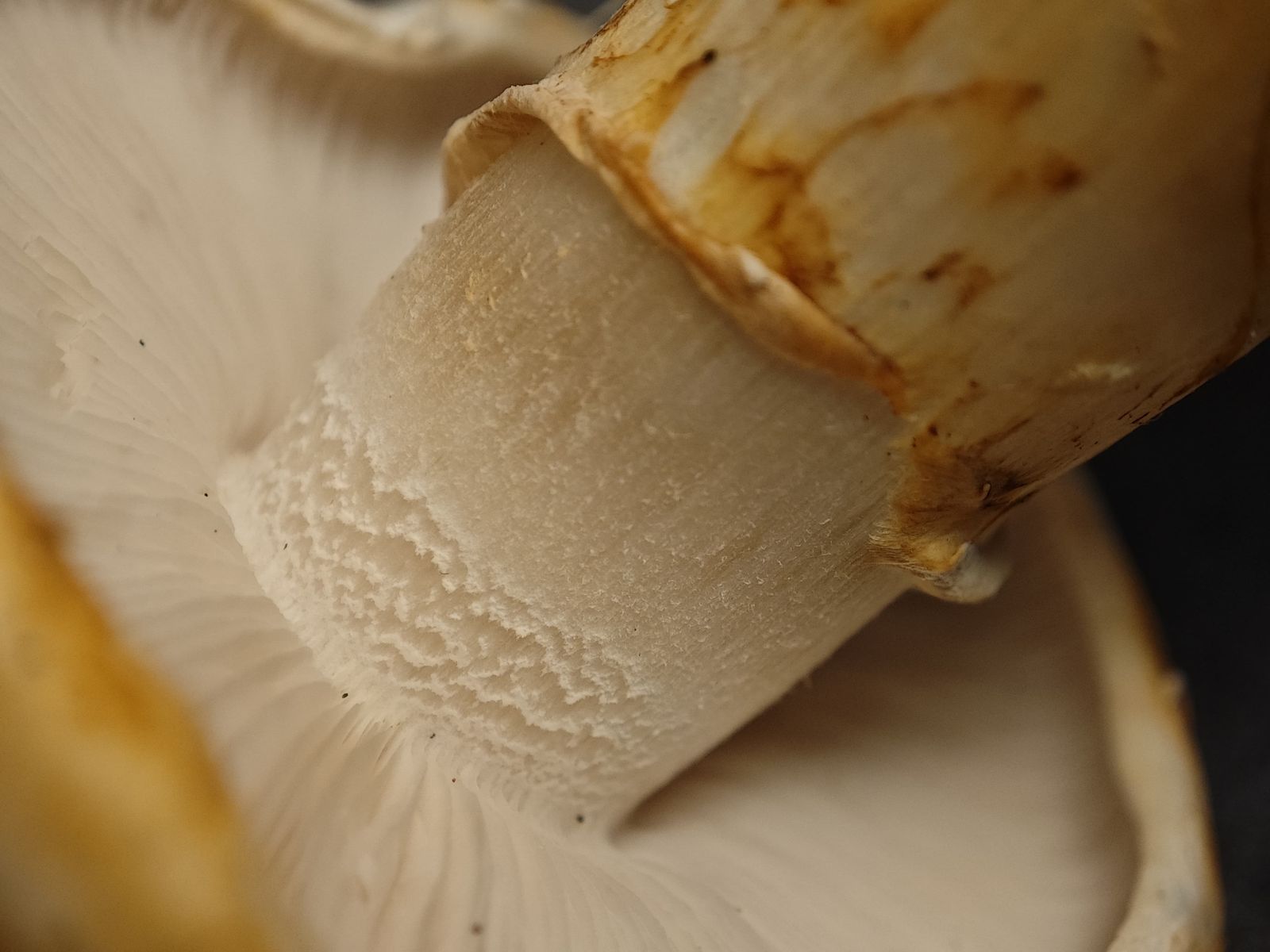Stiel: fest, mit Ring, darunter schuppig, an Lamellenansatz ausgebuchtet, punktiert