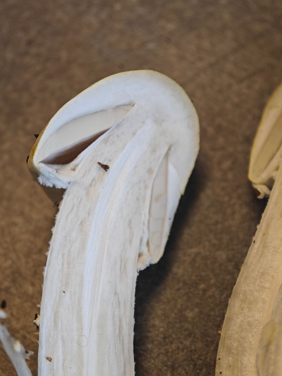 Stiel : weiß, flockig knollige Stielbasis, Myzelfilz, oberhalb hohl werdend
