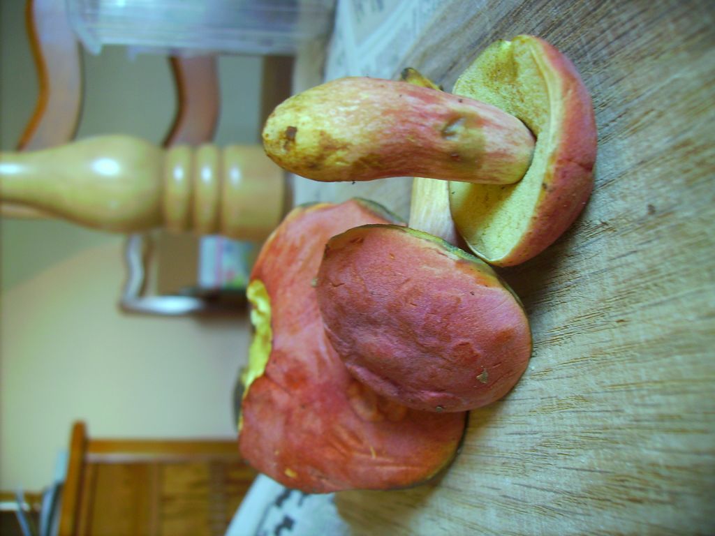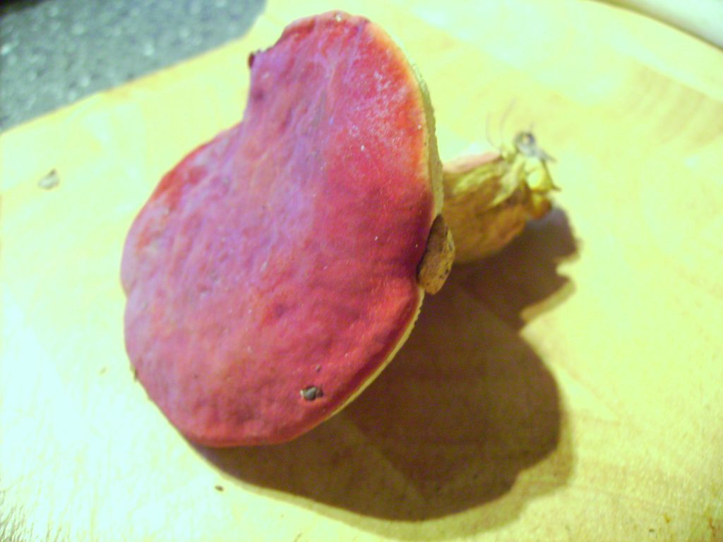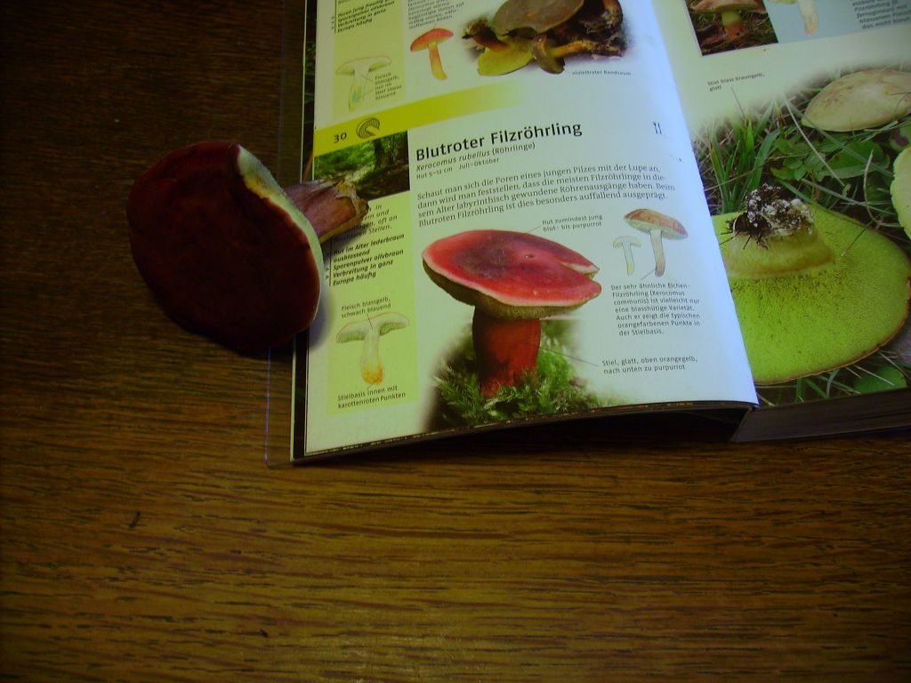 Ich hab auch noch einen: "... nach unten hin karminrot, mit deutlich erhabenem, hellen Netz überzogen, bei Berührung blau verfärbend" Auf dem Bild kann man aber selbst mit Lupe kein Netz (im Sinne von Boletus Luridus, bei dem man das auch fühlen kann) erkennen.