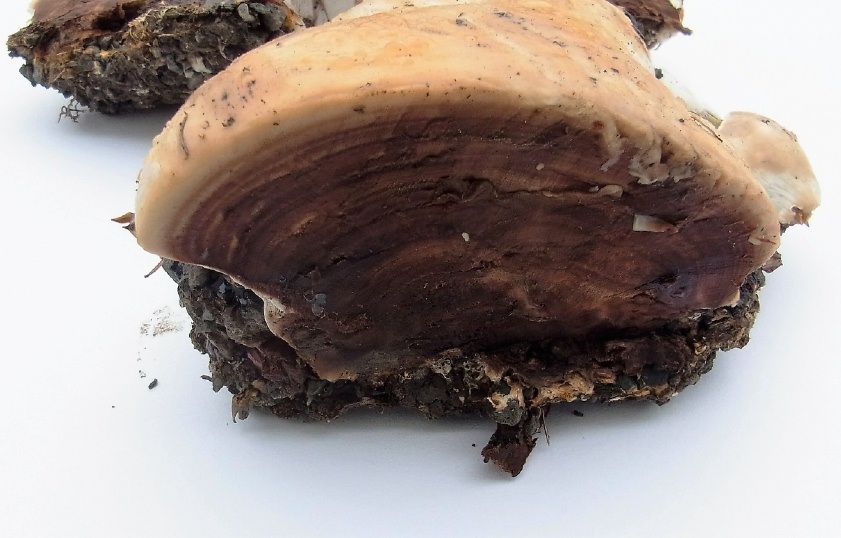 Der Baumpilz hat eine fast weiße, samtige, klebrige und schwammartige Oberfläche. Seitlich erkennt man sehr feine Poren. Nach dem Durchschnitt erkennt man nur eine dünne weiße (Oberfläche) und den dunklen Kern mit einer Art "Jahresringstruktur", die aber erst dunkelrotbraun ist, nach dem Trocknen ocker- bis rotbraun. Es besteht eine große Ähnlichkeit mit einem geräucherten Schinken mit Speckschicht (siehe Detailaufnahmen).