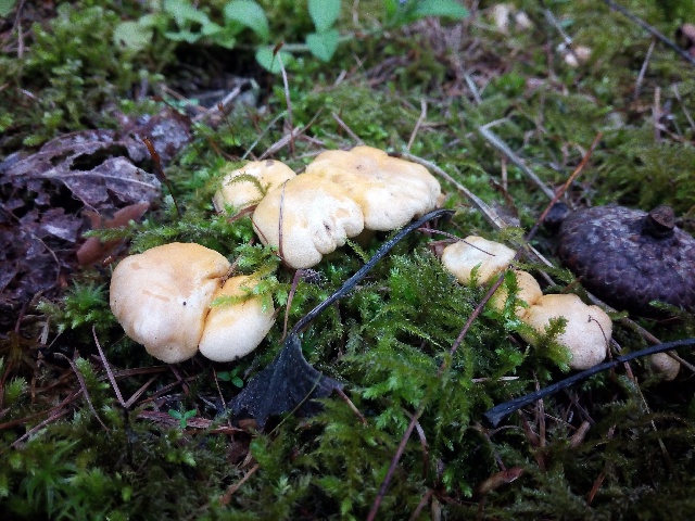 Ein weiterer Pilz, dessen Namen ich (noch) nicht kenne, ist dieser Becherling (oder doch Öhrling?), der in unmittelbarer Nähe von den Milchlingen mehrere Fruchtkörper bildete. Auf eine Geschmacksprobe verzichtete ich, als einziges Merkmal kann ich nur den Geruch angeben, den ich als etwas muffig bezeichnen würde. Vielleicht weis ja jemand von euch, um welche Pilzart es sich handeln könnte.