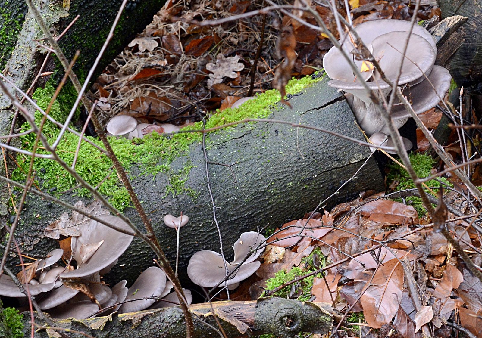 Aha, auch dieser stark bemooste Baumstamm war des Blauen Rinden-Helmlings Wahlreich.