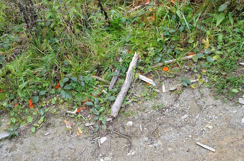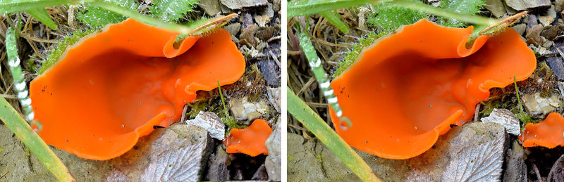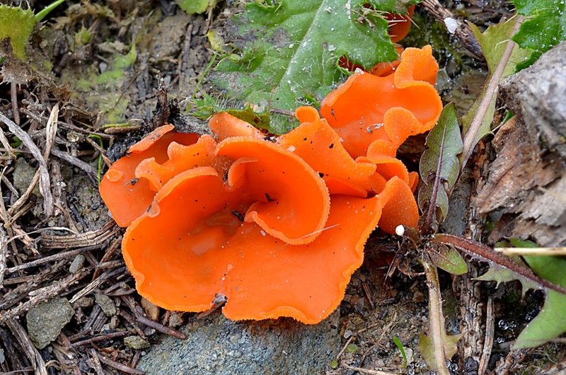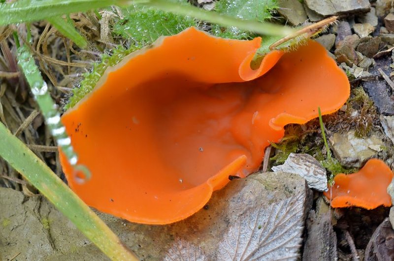 Ein Wegstreifen mit Orangebecherlingen Aleuria aurantia,