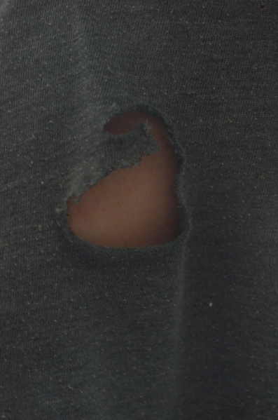 sein T-shirt hatte sich in einer Ritze der Stuhllehne verhangen