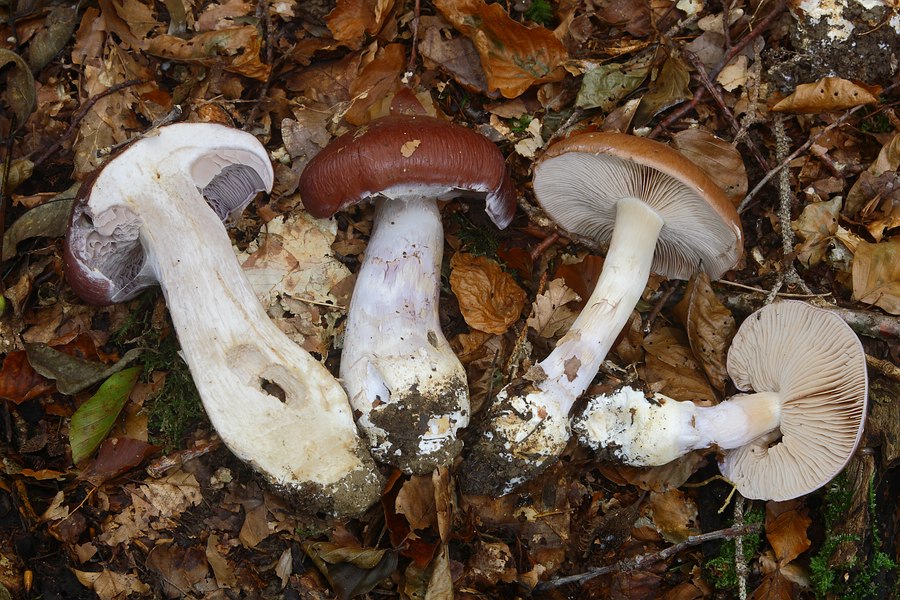Die gezeigten (jüngeren) Pilze sind stämmig, bereits gut über 10 cm hoch und schwer. Die Huthaut ist auffallend dick und mit den Fingern am Stück abziehbar, die Farbe des Hutes ist dunkelbraun, die Lamellen haben einen violetten Touch, ebenso der Stiel.