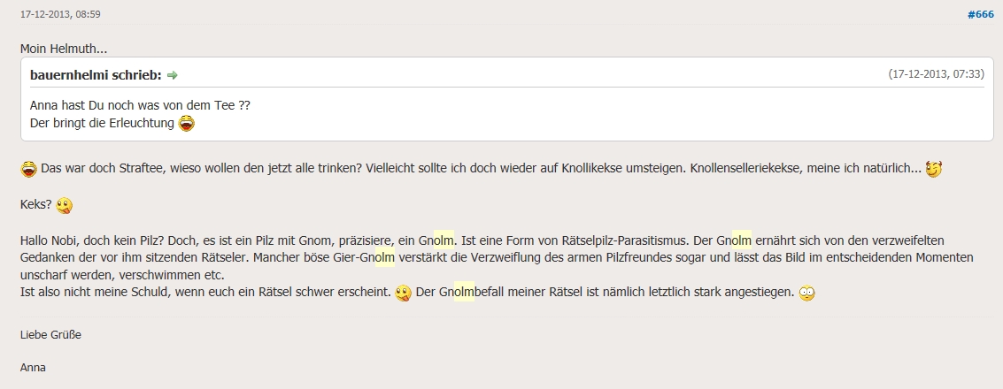 Gnolme: Koboldartige, imaginäre Wesen, die dieses Rätsel vollständig durchdrungen haben und ein ungesteuertes Eigenleben führen. Von Tuppie aufs Vortrefflichste portraitiert. Der Name hat seinen Ursprung in den Begriffen "Gnom" und "Olm".