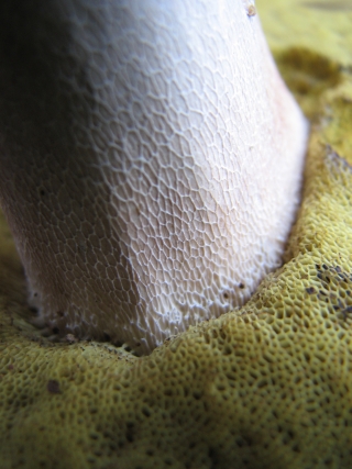 STIEL: gleich dick bis leicht keulig, unten weiß, oben sehr hellbrau m. weißer Netzzeichnung (leicht erhaben).