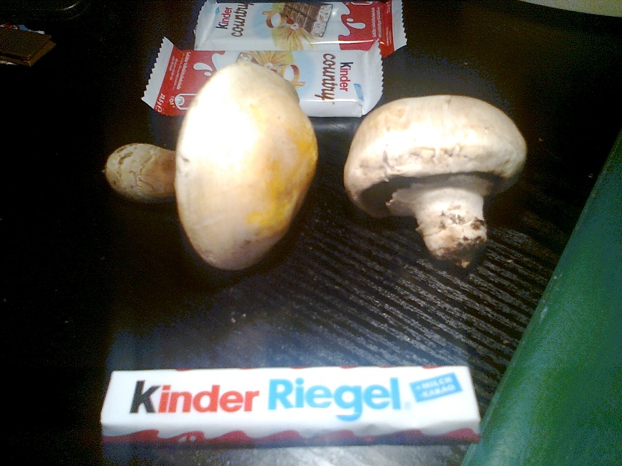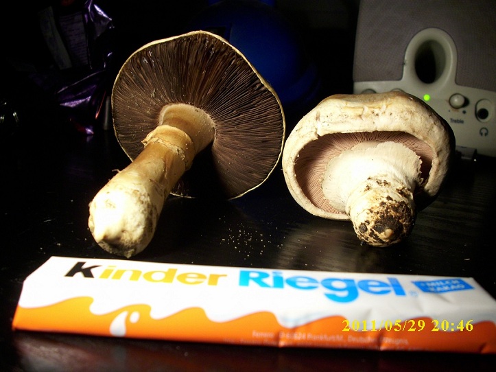 Als Größenvergleich soll mal der Kinderiegel herhalten (11cm). Er riecht eigentlich auch typisch nach Champignon (also der Pilz, nicht der Riegel), sehr angenehm halt, leicht holzig. Der große riecht dabei bedeutend intensiver und würziger. Beim großen sind die Lamellen richtig schokobraun, beim kleinen deutlich heller. Stiel vom großen leicht braun, beim kleinen alles weiß.Auf dem Foto wirkt es so als wären beim großen ein paar gelbliche Flecke auf dem Hut die ich so eigentlich gar nicht sehe, hmm. Eher so ocker. Kann aber auch am Licht liegen hier.