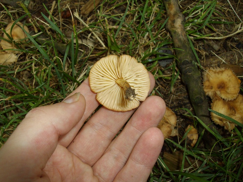 Ich hoffe mal, dass es sich nicht um unterschiedliche Pilze handelte, da sich die Hutfarbe mal blasser mal mehr ocker war. Es waren mehrere büschelig wachsende nah beieinander liegende Stellen entlang des Wegrands.