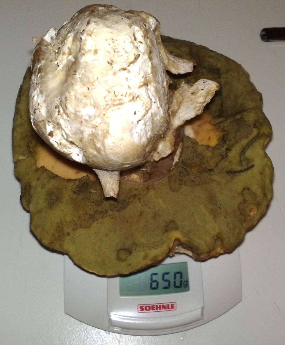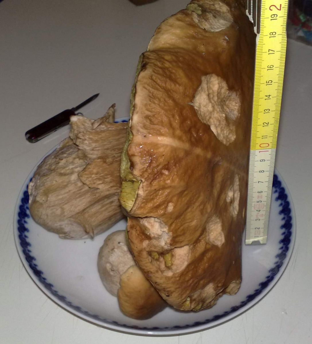Der Riesensteini mass genau 25 cm Durchmesser und war ca. 26 cm hoch. Trotz der Grösse und dem dicken festen Stil wog er nur ca. 500 Gramm. Vermutlich hatte er sich noch nicht wie manch anderer alte Riesensteini mit Wasser vollgesogen. Zum Glück, denn er hat nur ein paar wenige Maden im Hut gehabt und hat superlecker geschmeckt ![]()
