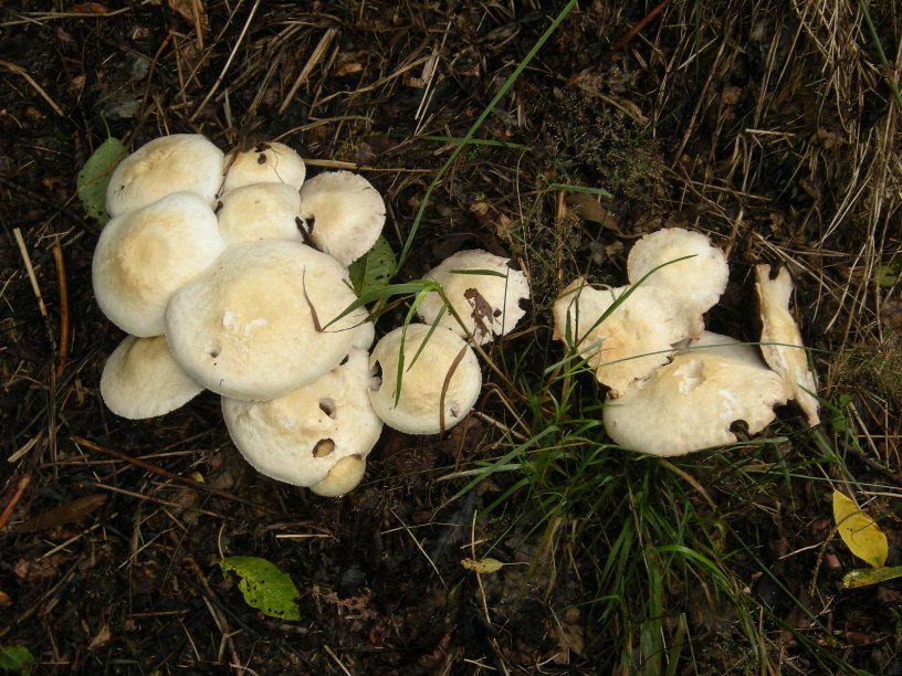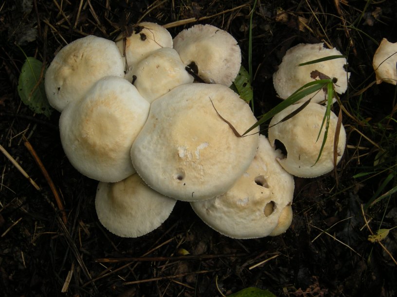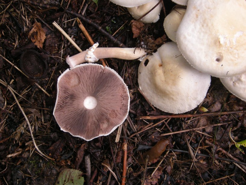 Auf meinem Haufen aus Grasabfällen wächst seit Jahren ein weißer Lamellenpilz, dessen Hutdurchmesser 25 cm überschreiten kann. Der Hut ist in der Mitte gelblich eingefärbt, jüngere Exemplare haben an seinem Rand einen violetten Schimmer. Die Lamellen haben dieselbe Farbe wie die des Wiesenchampion. Für spanische Wegschnecken scheint der Pilz eine Delikatesse zu sein, da sie den Schirm nach wenigen Tagen kräftig angefressen haben. Ich habe dasselbe (--gegessen) zwar nicht vor, wüsste aber gerne um welchen Pilz es sich handelt.