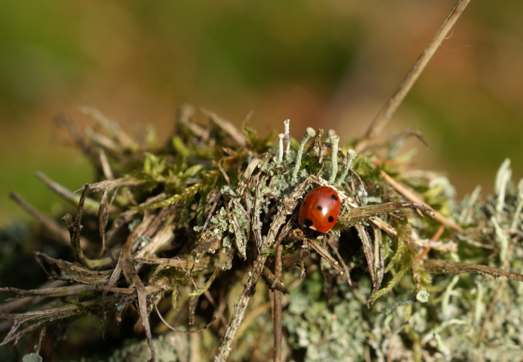 Diesen ziemlich schwarzen "Pilz" fand ich recht eigenwillig. Er wuchs aus einem Grübchen eines Birkenstammes und war etwa so groß wie eine Pampelmuse. Bei näherer Betrachtung war es aber Holz, das wie ein Geschwür am Baumstamm klebte. Siehe auch Makroaufnahme.Objekt 4 - Marienkäfer mit Trompetenflechte