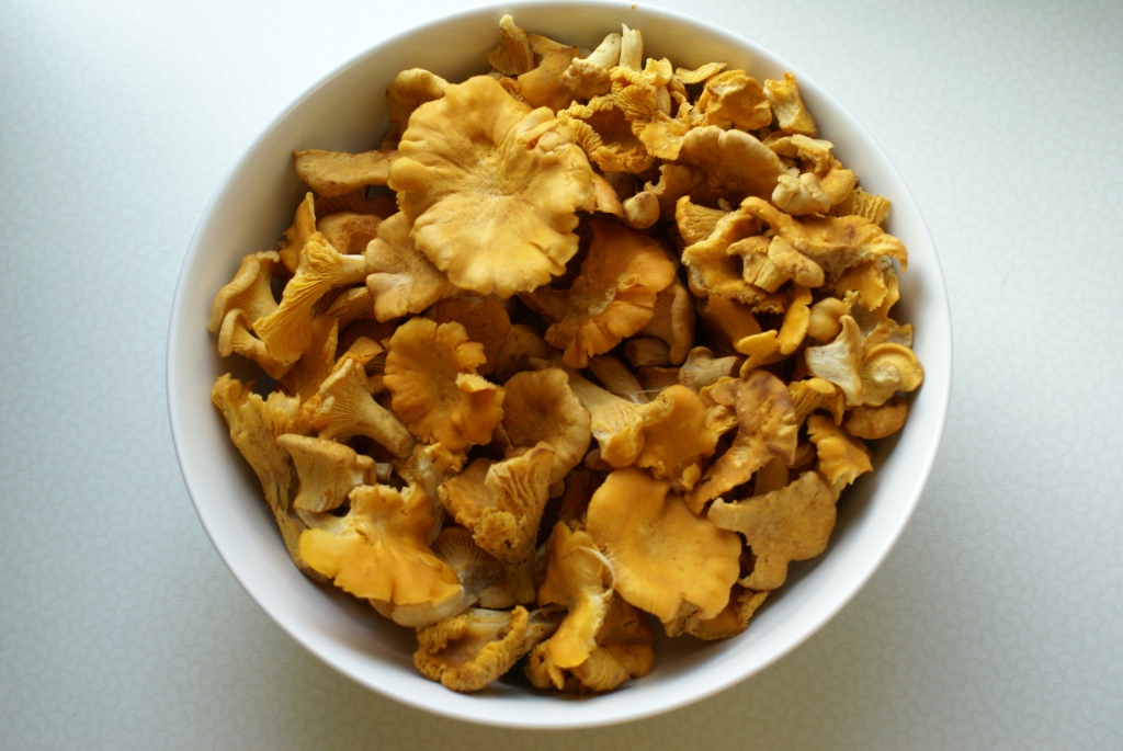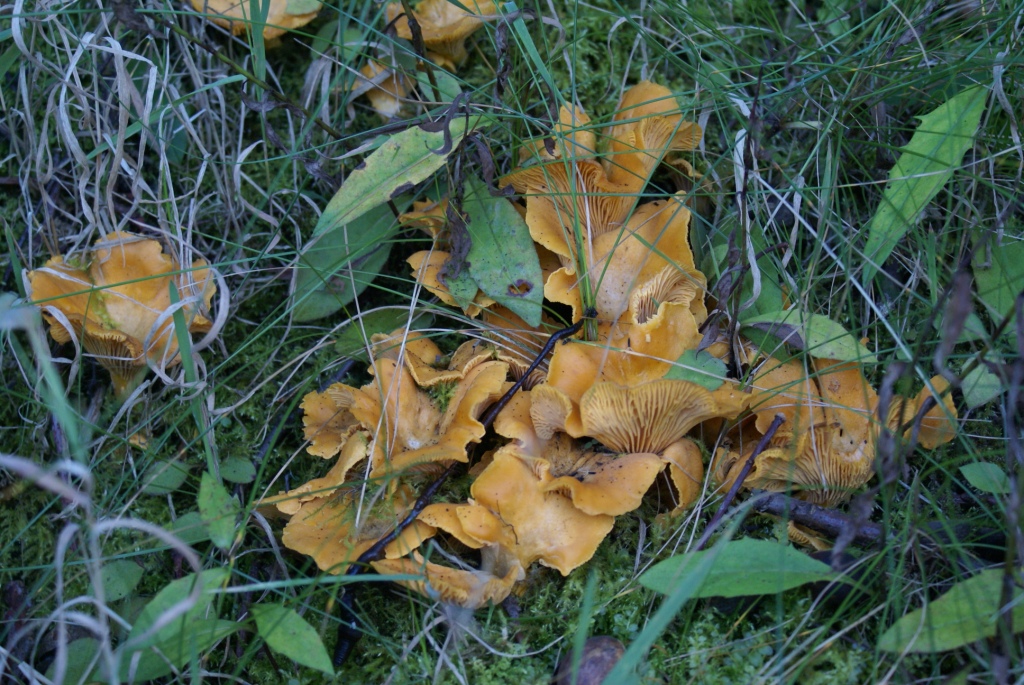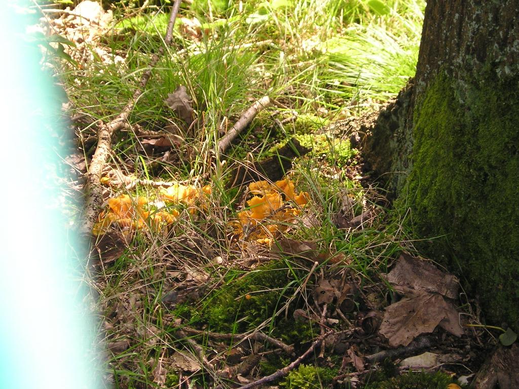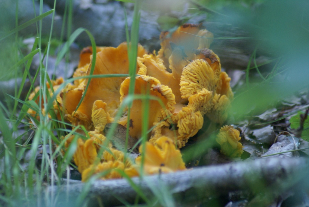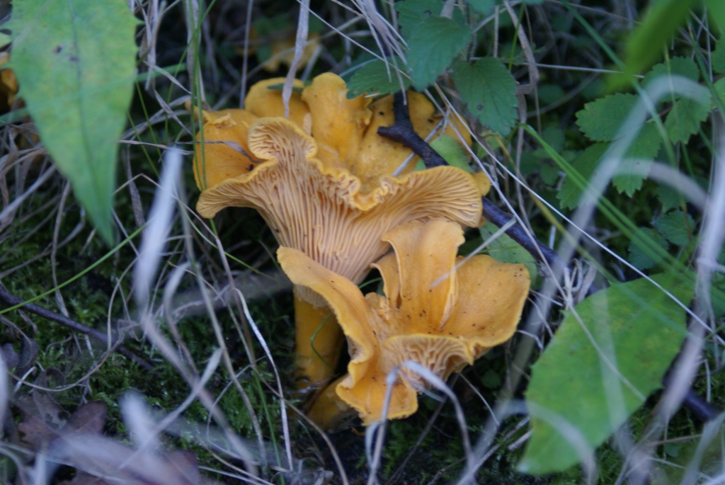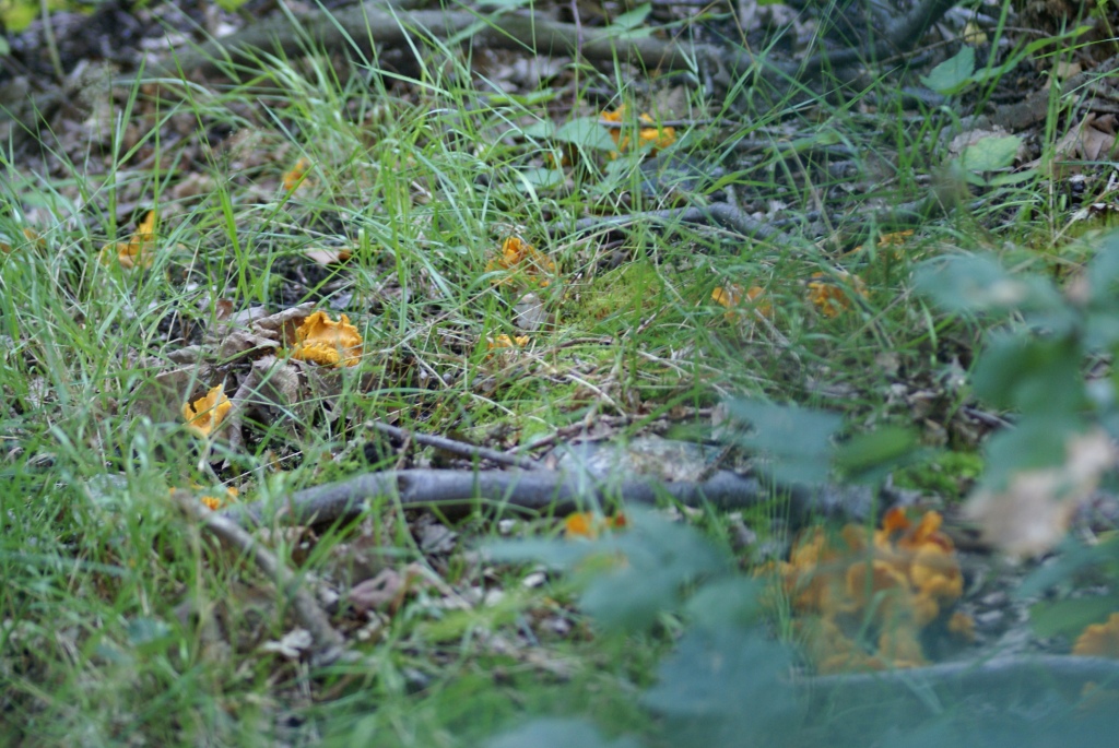 Vor vier Wochen entdeckte ich an einem Donnerstag auf der Bahnfahrt zur Arbeit am Bahndamm ganz oben bei Eichen etwas gelbes. Für den Schwefelporling zu spät, zu klein, nicht am Baumstamm, sondern am Boden... farblich kam eigentlich nur der Pfifferling in Frage. Das Wochenende war vorbei, ich suchte natürlich im vorbeifahren wieder an der gleichen Stelle - es war der Hammer, aaaalles voll gelber Pilze, Unmengen! Es konnten nur noch Pfifferlinge sein.