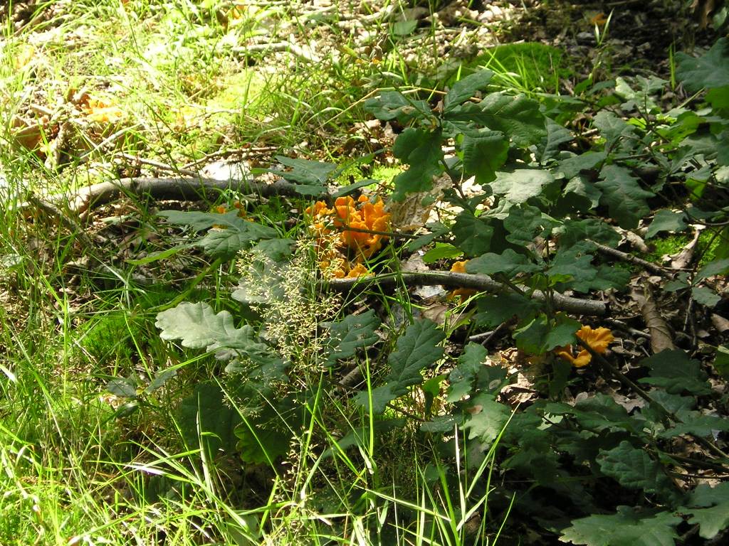 Diese "Eichen-"Pfifferlinge sind vom Fleisch auch etwas anders als die im Nadelwald: deutlich kompakter, stellenweise büschelig wachsend (fast wie Besteck im Geschirrspüler). Die Hüte weniger elastisch als bei Nadelwald-Exemplaren bis leicht brüchig, besonders am Hut. Die büschelig wachsenden können ihre Hüte gar nicht entfalten, sondern entwickeln sie schüsselförmig nach oben, so dass die Lamellen deutlich zu sehen sind.