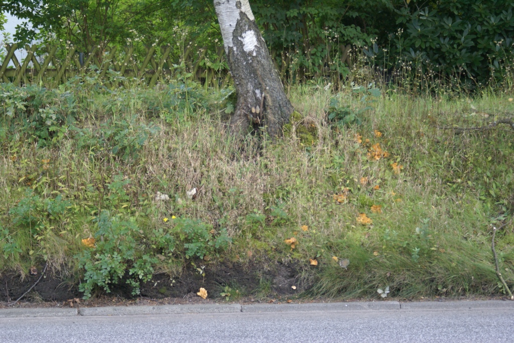 Und jetzt habe ich wieder Pfifferlinge entdeckt, direkt an einer viel befahrenen Straße, ebenfalls bei Eichen, jedoch fast ringförmig im Wurzelbereich einer zwischen Eichen stehenden Birke.