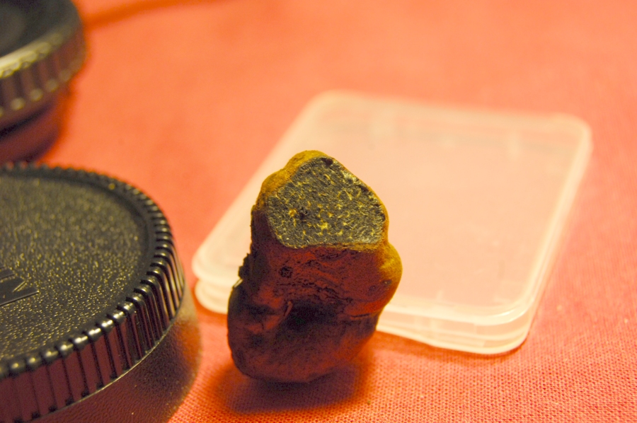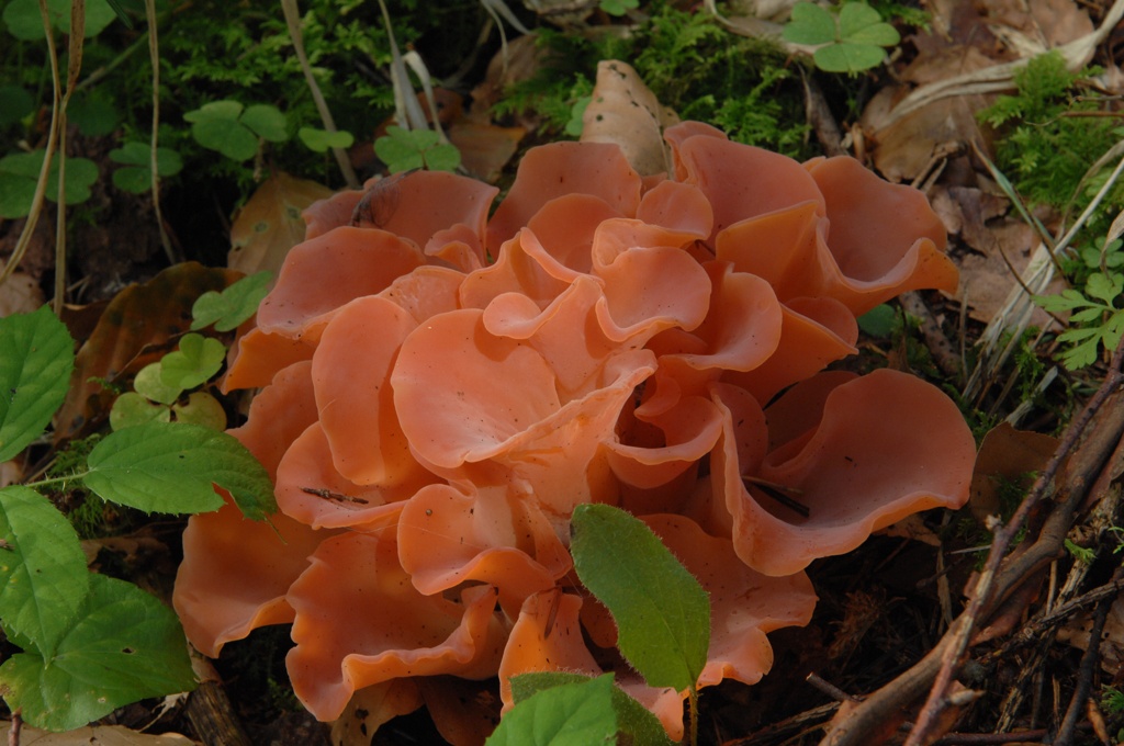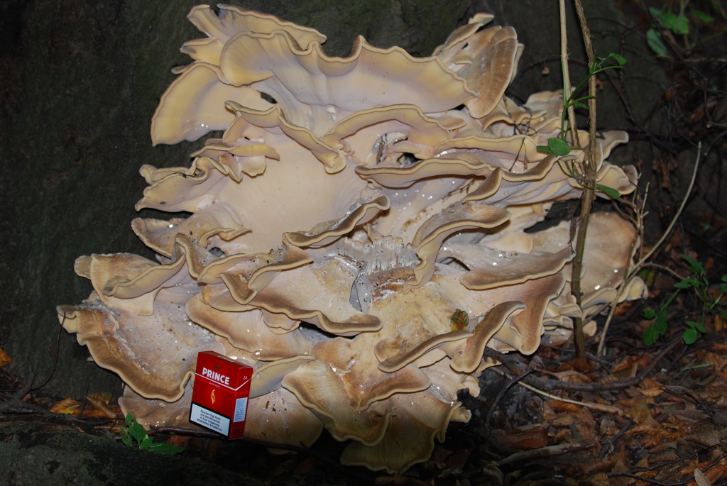Hier also das Bild eines Pilzes, den wir nicht kennen, dessen Namen wir nicht herausfinden konnten und den wir beide optisch recht attraktiv finden. Fällt jemandem dazu vielleicht ein Hinweis ein? Wir fanden ihn am Rande eines mäßig geschotterten Wegs durch einen Mischwald (Hochschwarzwald), zwar unter den Bäumen, aber noch an einer recht hellen Stelle. Es gibt dort Steinpilze, Pfifferlinge, Hexenröhrlinge, Boviste sahen wir auch, ebenso Stockschwämmchen und Satanspilz. Als Größenhinweis könnten die Buchenblätter im Bild dienen - ich sag mal, der war vielleicht so groß wie eine Untertasse.