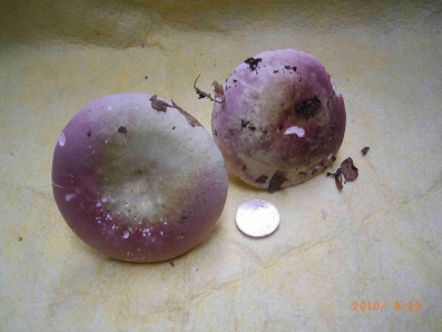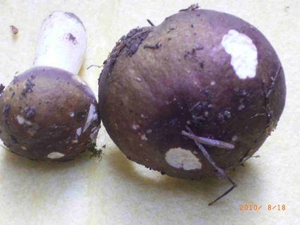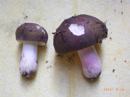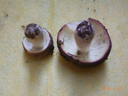 Beim größeren:Hutfarbe lila/violett(?)mit hellen Einsprenkelungen, d 8cm, trocken,in der Mitte leicht trichterförmig. Stiel 6,5cm Länge, d 2cm, unten d 3cm
