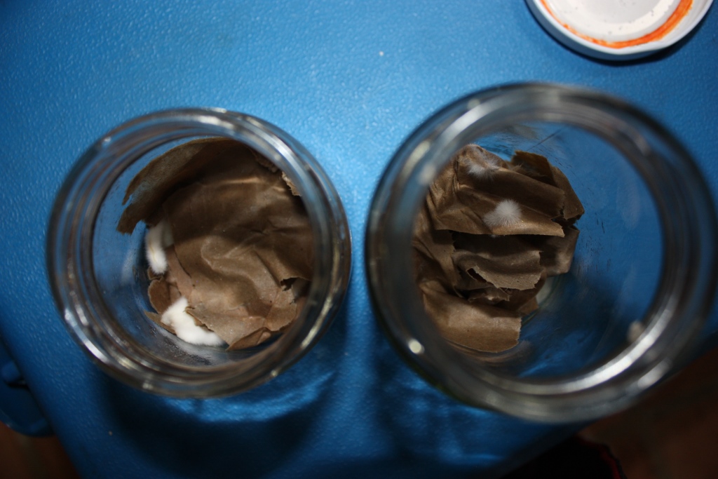 Heraus kamen 2 Gläser mit Pappe normal, 1 Glas mit Pappe und Pilz geknüllt, ein Glas mit aufgeweichten Holzpellets, ein Glas mit Stroh und Pappe.