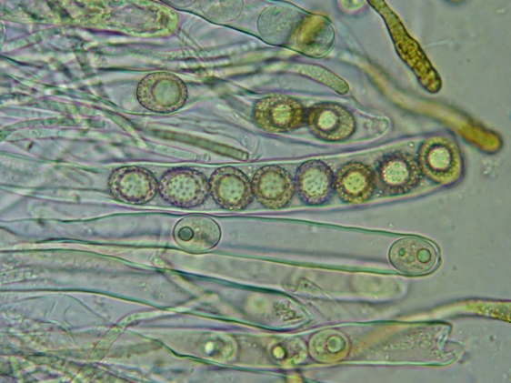 Die Asci messen 195 - 219 x 19,5 - 24,5 µm und sind lang gestielt. Mit Lugol färbt sich der Inhalt stark dunkelbraun.