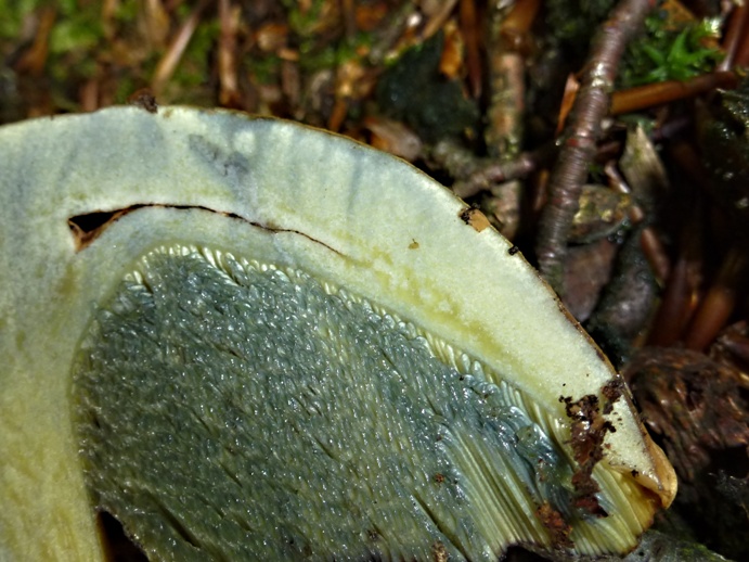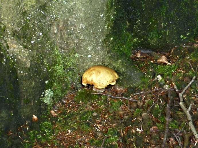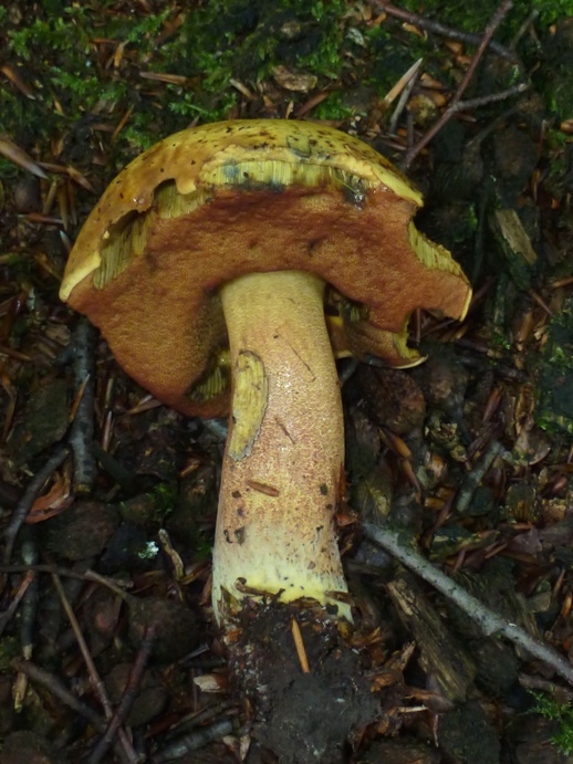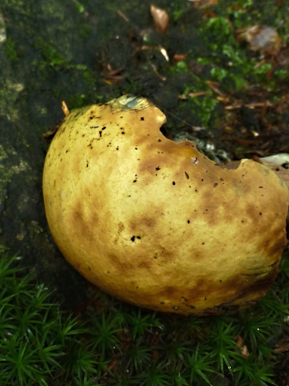 Direkt am Fuß einer Rotbuche fiel er schon von weitem durch seine gelbe Farbe auf. Das Fruchtfleisch war noch fest, so schließe ich eine altersbedingte Verfärbung aus.