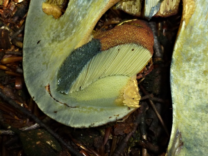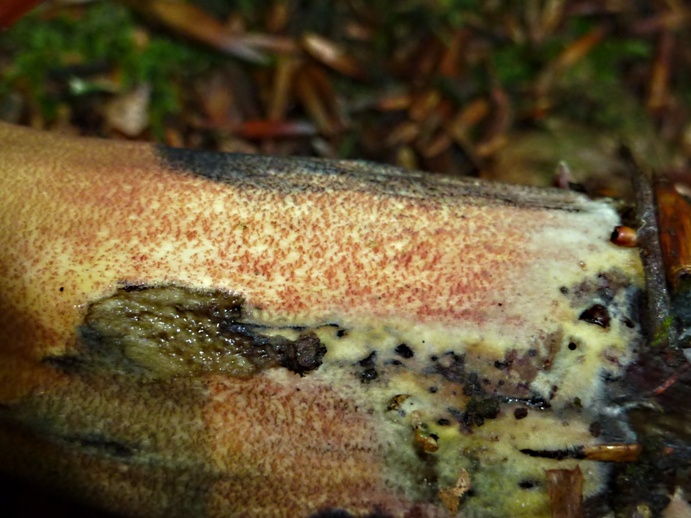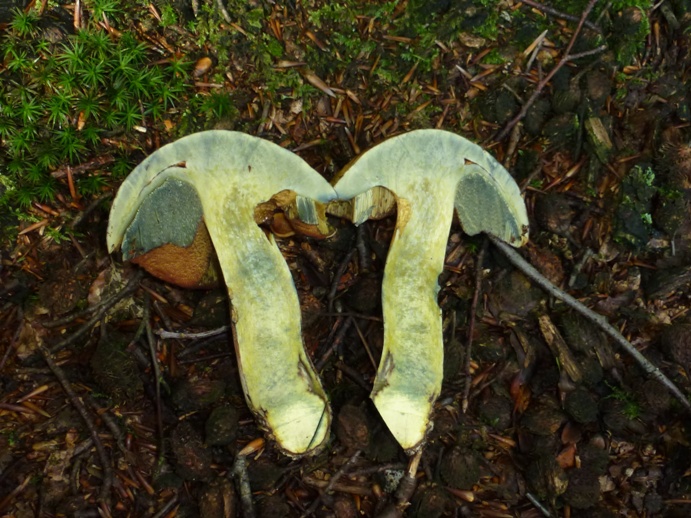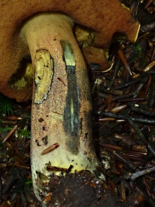 Angekratzt reagierte er mit sofortiger und kräftiger Blaufärbung, auch in der Röhrenschicht. Im Längsschnitt blaut er kaum merklich. Das Fleisch war Geruch- und Geschmacksneutral. Die Details sieht man auf den Fotos recht gut.Ist das nun vielleicht eine Fehlfärbung von Boletus erythropus oder irgendwas abgefahrenes ?