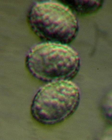 Sporen der gleichen Art, nur eingefärbt ohne Kondensoreinsatz. Schon besser, aber nicht gut.