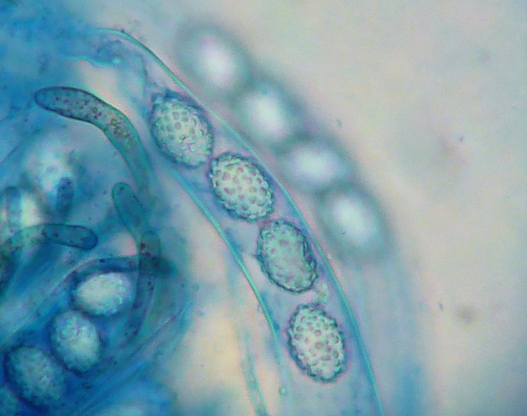 Nachtrag:Ich bin inzwischen dazu übergegangen, die Sporenmasse aus dem Perithecium herauszupulen und ohne das zu mikroskopieren. Die Perithecien sind oft so dick und hart, dass die Probe nicht plan unter dem Objektträger liegt. Das verzerrt dann den Blickwinkel und erschwert das vermessen.