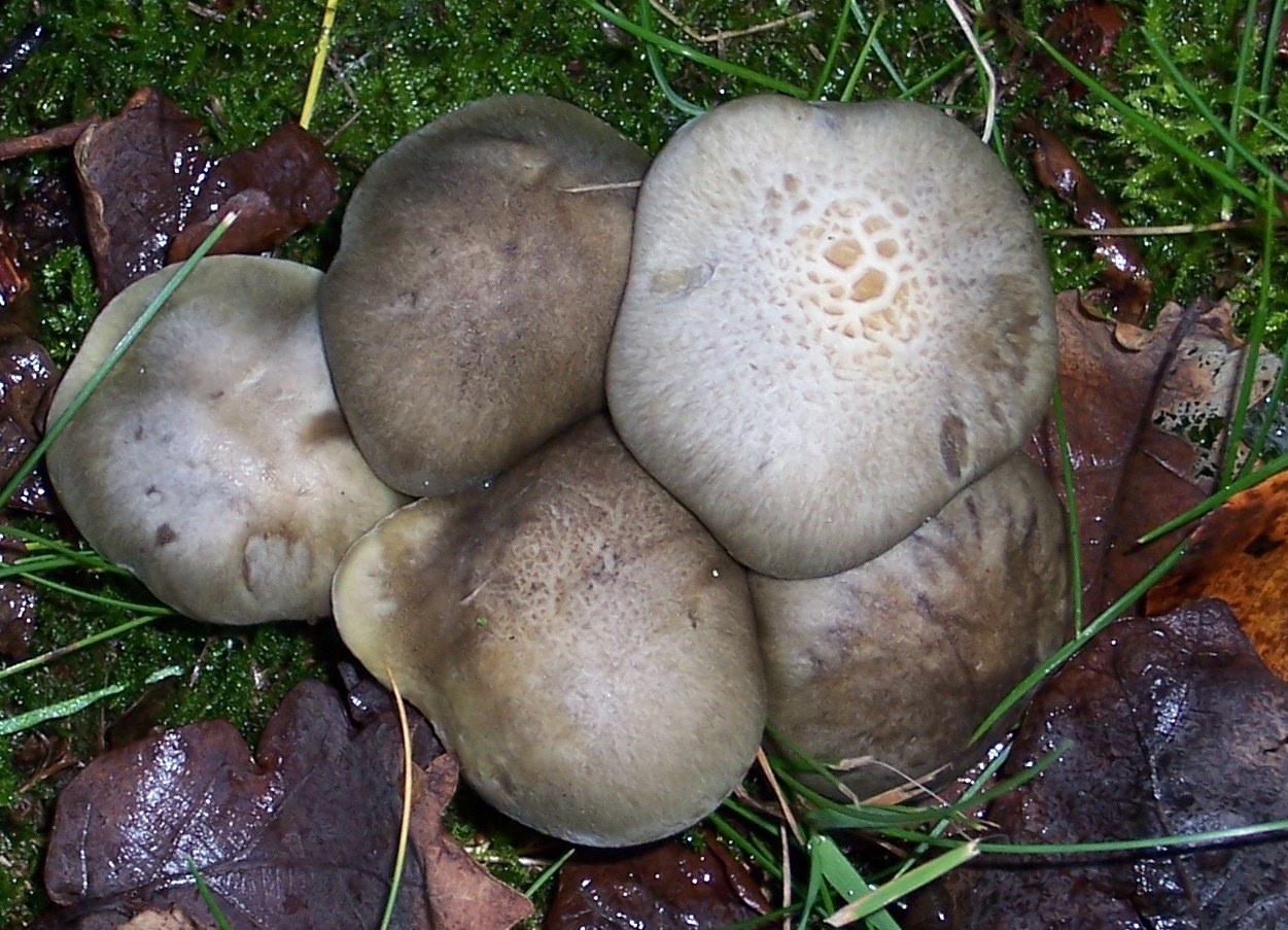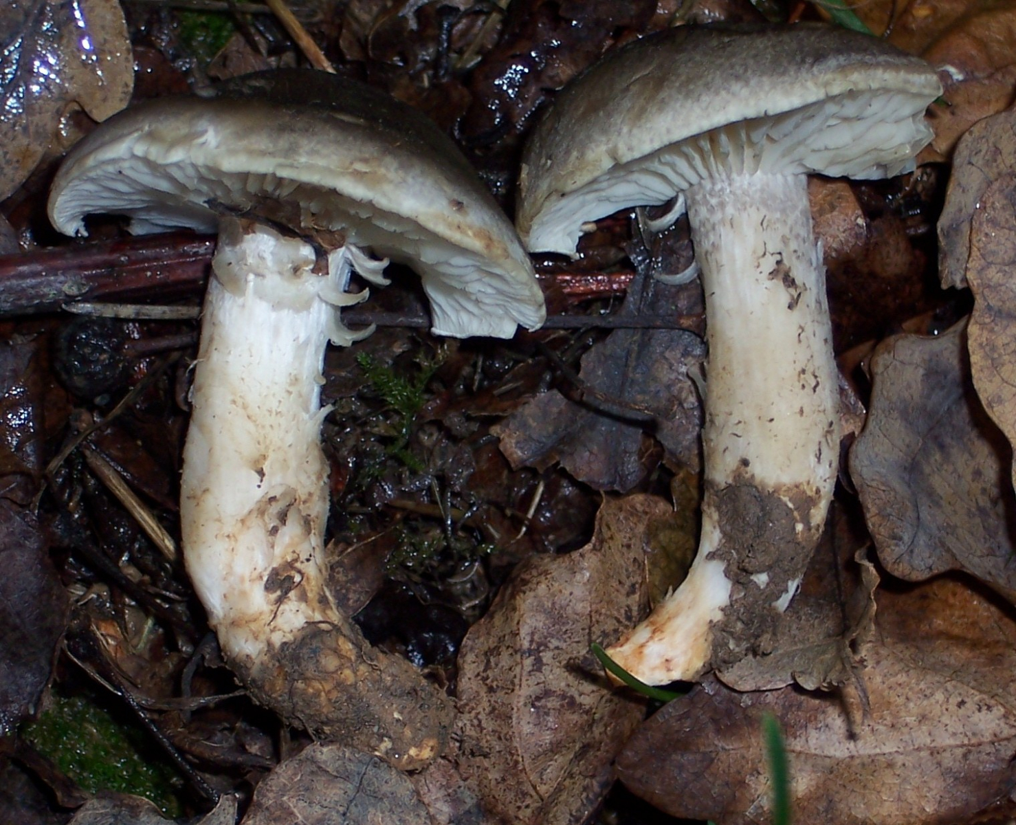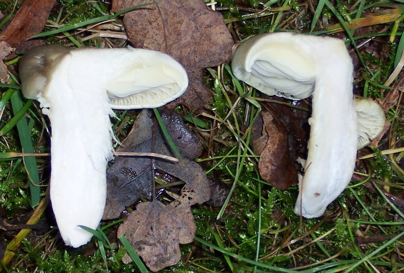 gestern war ich bei einem Waldspaziergang gefragt worden, was denn das für auffällige hellgrauen Pilze sind, die da herumstehen. Ich konnte nur murmeln: "Die sind aus einer schwierigen Gattung, ich verzichte auf eine Artbestimmung", obwohl ich im Moment noch nicht wusste, welche Gattung. Einen Fruchkörper umgedreht, Lamellen weiß, dazwischen rosa