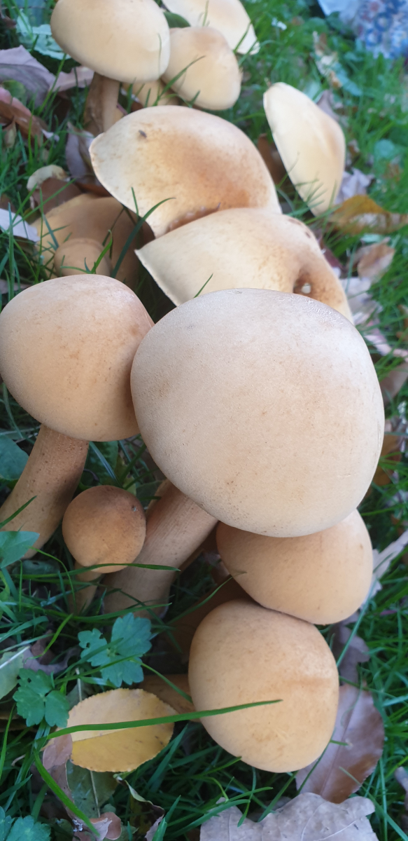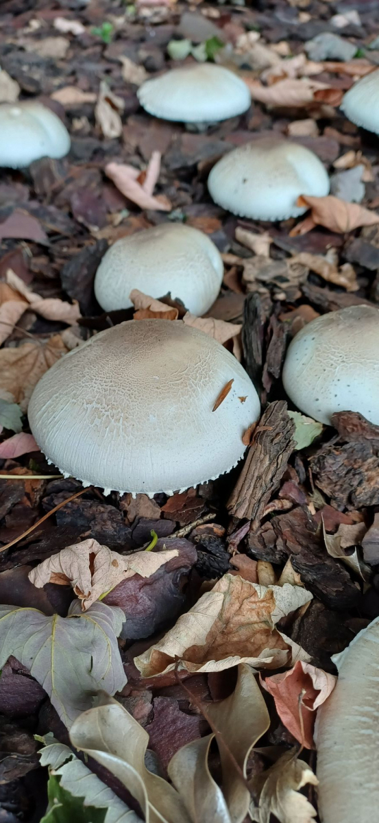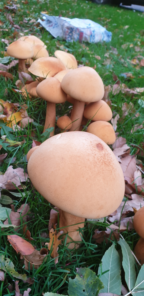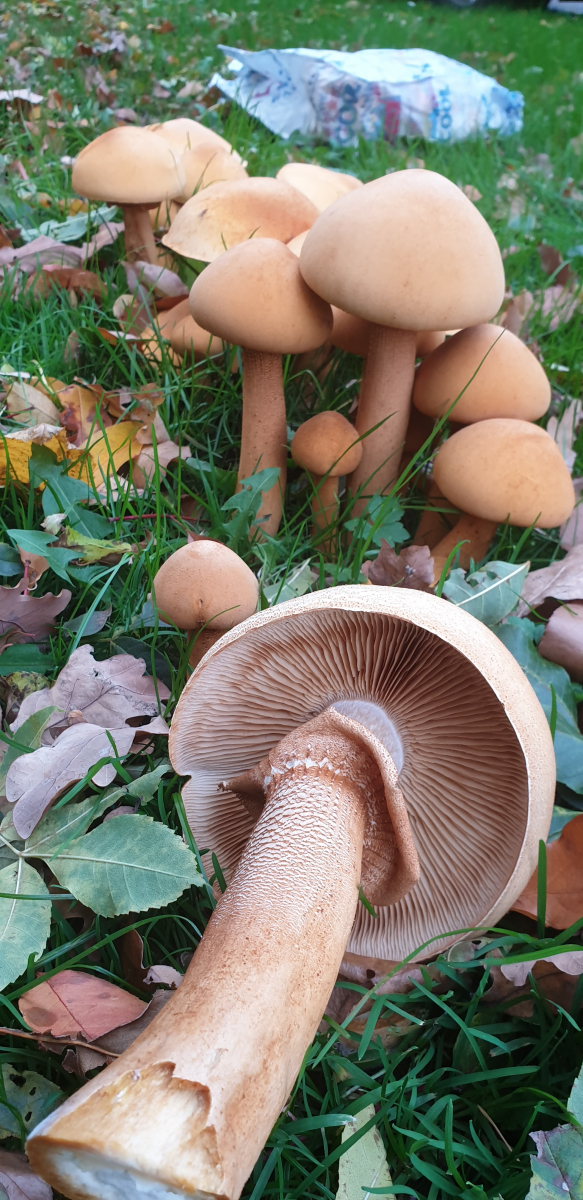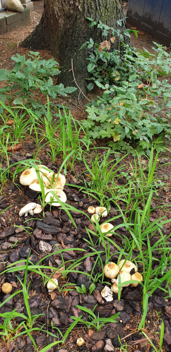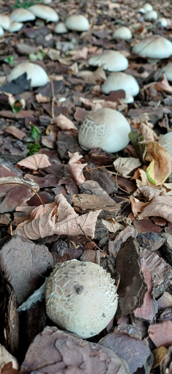 relativ langsam sprieste eine chapignonähnliche Pilzkolonie im Mulchbeet unseres parkartigen Gartens (der auch schon Steinpilze hervorbrachte) unter einer hohen Ahorngruppe und einer ca.7m entfernt stehenden, riesigen (>150Jahre) Rotbuche.